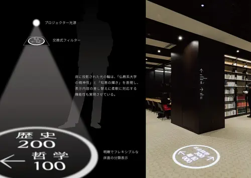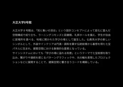 受賞コメント大正大学8号館は、「知と集いの渓谷」という設計コンセプトによって変化に富んだ 空間構成で成り立ち、学生が自由に居場所を選べる学びの場として誕生した。 図書館を中心とした機能を備えた新しいシンボルとして、外装やインテリアは伝統紋様 から着想を得た七宝パネルに包まれ、建築空間における象徴的な要素となっている。 サインシステムにおいても「学びの場に溢れる知恵」というテーマで七宝紋様を取り込み、 繋がりや連続を感じるパターングラフィックや、光の輪を表現したプロジェクション などに展開することで、建築空間と響き合うコードを構築している。