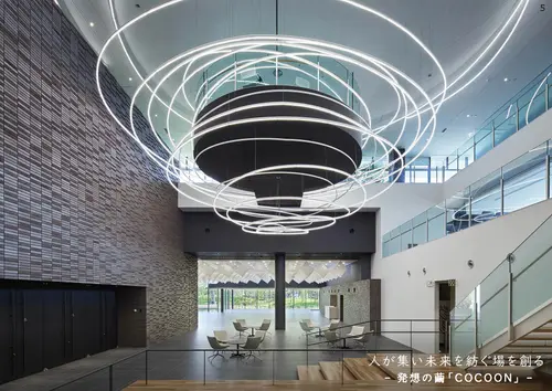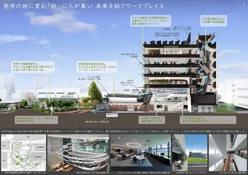 受賞コメント創業以来100年、革新を続ける自動車内装材メーカーが、この先の100年も社内外と協働することで新たな価値を生み出す場。社員と世界中で植樹を続けるグローバル企業の本社は工場群の中心に人をとりまく「杜」とした。会社の垣根を越えた協働を生み出す場「発想の繭COCOON」、自社の抗ウイルス帯電防止技術を応用したファブリック天井、日射負荷67%低減と眺望を同時に実現するスクリーンなど、新しいあり方を追求し価値を創出した。