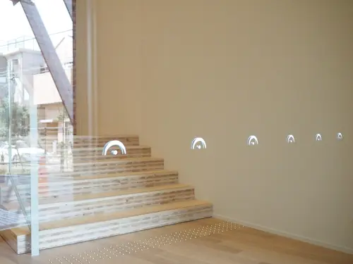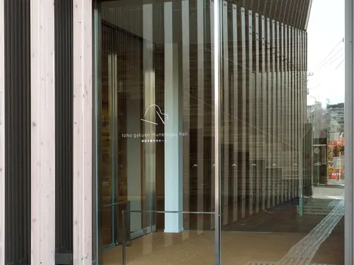 受賞コメント桐朋学園の新しい木造音楽ホールのサイン計画。建築には⽊構造の新しい主役として注⽬されているCLTを⽤いて折り紙にヒントを得た折板構造を作り、世界初の⽊造⾳楽ホールをデザインした。ホワイエの内装や、講義室にもCLTを積極的に使用し、座席表サイン、室名サインもCLT特有の木目をデザインに取り入れ、案内マップやトイレサインもCLTの凹凸感と調和する立体的な木のオブジェとしてデザインした。 また、学園の先生たちと相談し、衝突防止サインには、イタリア語で「停止させる」を意味する語源をもち、延ばして演奏するように指示する記号のフェルマータを採用した。