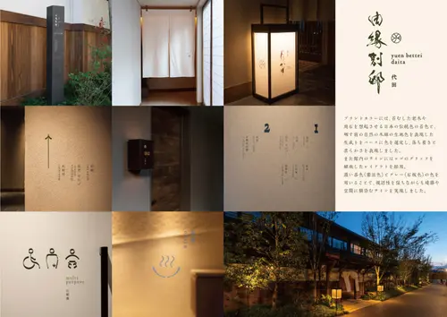 受賞コメント「由縁別邸 代田」は、より落ち着いた、閑静な住宅街に位置する「市中の山居」がコンセプトの温泉旅館です。ロゴデザインは、書家 武田双龍氏の書を用い、屋敷の格子からインスパイアを受けたグリッドで構成。そして「onsen ryokan 由縁」シリーズで使用している家紋を彷彿とさせるロゴマークを横に添えています。ブランドカラーには、苔むした老木や庭石を想起させる日本の伝統色の苔色と、晒す前の自然の木綿の生地色を表現した生成りをベースに色を選定し、落ち着きと柔らかさを表現しました。また館内のサインにはロゴのグリッドを継承したレイアウトを採用。濃い茶色(憲法色)とグレー(石板色)の色を用いることで、視認性を保ちながらも建築や空間に馴染むサインを実現しました。