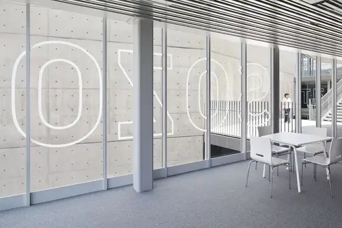 サイン計画ではこのガラス面に対し、室内で行われる活動や備わった機能を象徴する英文字の大型タイプフェイスを展開した。空間の意味性が大きく示されることで、より活発な活動をうながすことができれば良いと考えた。