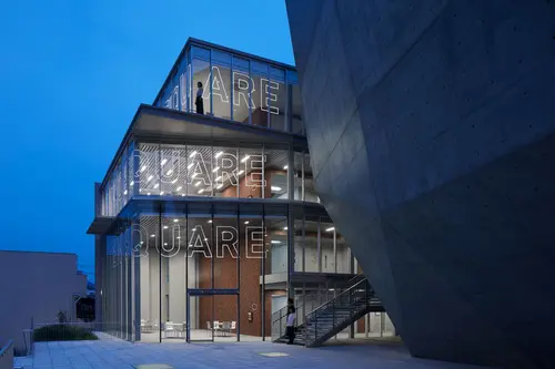 本施設は演劇・コンサートを行うためのホールを始め、ギャラリーやイベントスペース、ラウンジなど多様な課外活動室を備えており、各課外活動室とパブリックスペースとの境界は多くがガラスで仕切られている。