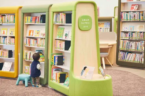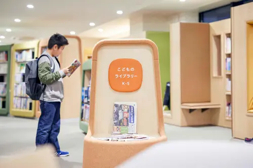 市の特徴を表す色は、書架サインの色ともリンクしており、図書の分類機能を果たしている。