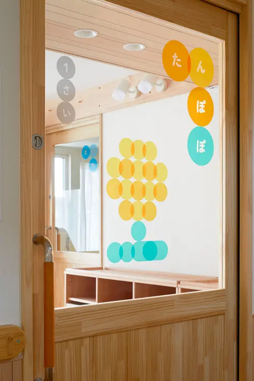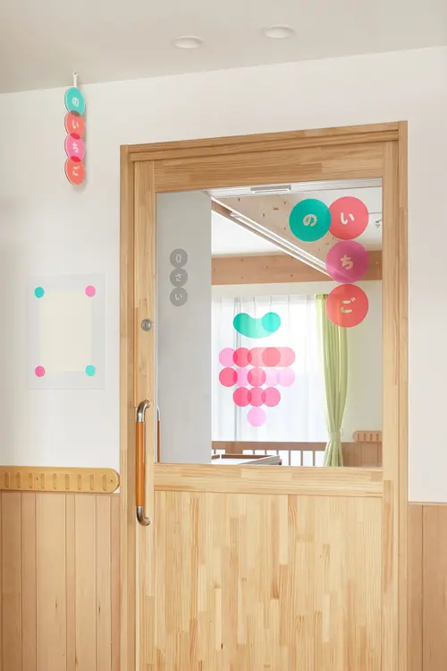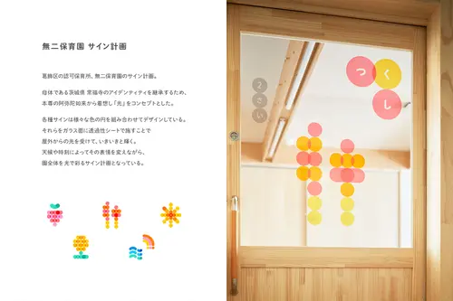 受賞コメント葛飾区の認可保育所、無二保育園のサイン計画。母体である茨城県 常福寺のアイデンティティを継承するため、本尊の阿弥陀如来から着想し「光」をコンセプトとした。各種サインは様々な色の円を組み合わせてデザインしている。それらをガラス面に透過性シートで施すことで 屋外からの光を受けて、いきいきと輝く。天候や時刻によってその表情を変えながら、 園全体を光で彩るサイン計画となっている。