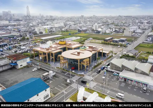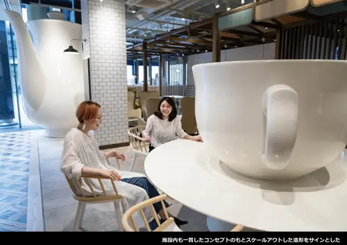 受賞コメント家族団欒の情景をダイニングテーブル状の建築にすることで、企業・地域の絆を育む拠点としてシンボル化。建物全体の世界観を崩す具体的なサインを避け、施設内のオフィス、銀行、ショップ、カフェといった各コンテンツを連想する、あくまで食卓にある日常のアイテムをスケールアウトしたオブジェとして配置し、直感的にわかるサイン機能とした。