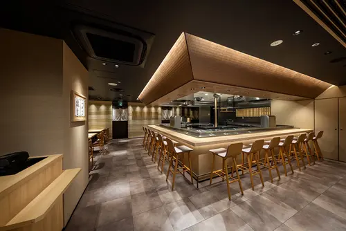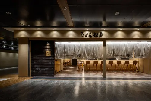 名古屋に古くから残る町並みを連想させる鎧貼の外壁とヒノキのサインで老舗感を残しつつ、大きな暖簾が目線をゆるやかに区切りながらファサードを構成します。