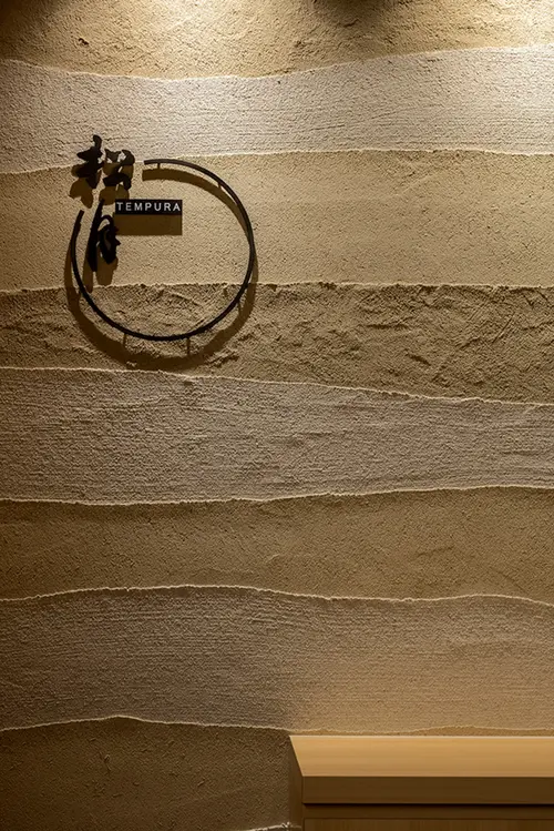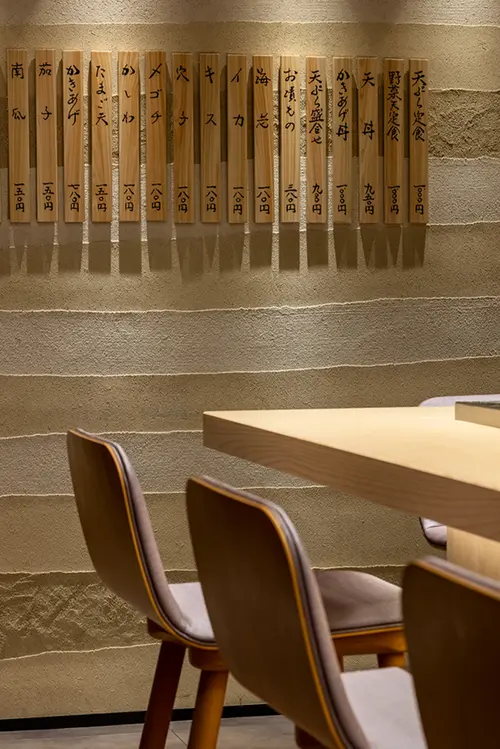 店内は銅鍋の叩き出しをイメージした下り壁と衣のような色合いの版築壁で構成し、木札メニューは形状をシャープにすることで、スタイリッシュさと見やすさを意識した計画としました。