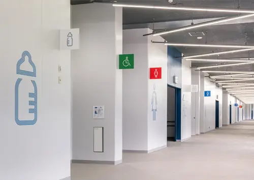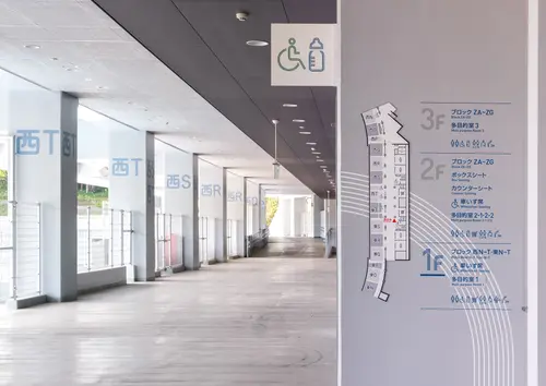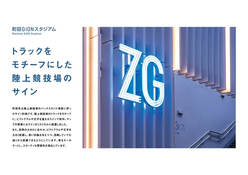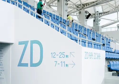 作品意図トラックをモチーフにした陸上競技場のサイン 陸上競技場のバックスタンド増設に伴ったサイン計画です。 競技トラックをモチーフに、ピクトグラムや文字を重なるラインで表現しました。切り取り方を変え、マップの背景にもラインをリズミカルに配置しています。 また、空間の広さに合わせピクトグラムや文字を大きく配置し、混雑していても遠くから認識できるようにしています。青を基調とし、スポーティな雰囲気を出しました。