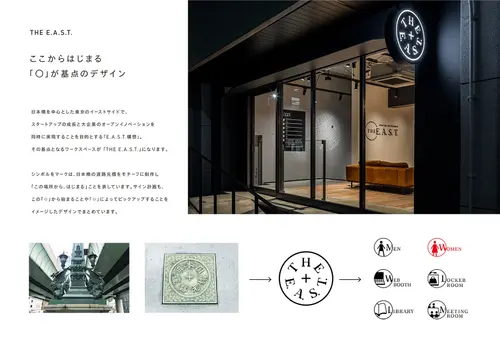 受賞コメント日本橋を中心とした東京のイーストサイドで、スタートアップの成長と大企業のオープンイノベーションを同時に実現することを目的とする「E.A.S.T.構想」。その基点となるワークスペースが 「THE E.A.S.T.」になります。シンボルをマークは、日本橋の道路元標をモチーフに制作し「この場所から、はじまる」ことを表しています。サイン計画も、この「○」から始まることや「○」によってピックアップすることをイメージしたデザインでまとめています。
