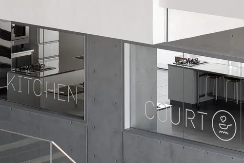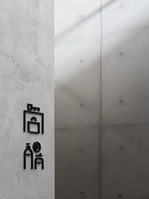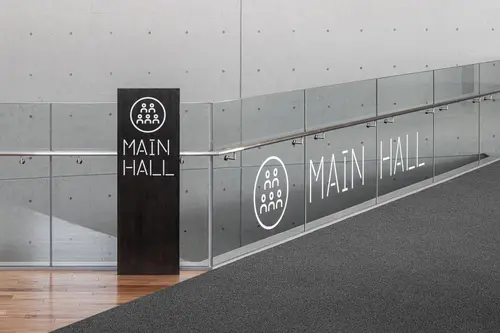 ホールの屋根の形に準じて並べ方を変更することで、1Fと2Fのエリア分けを行っています。オリジナルのピクトグラムは、「瓦当文」をモチーフに精細な模様や文字を用いて制作しました。