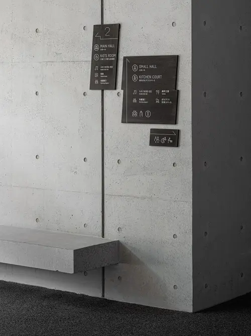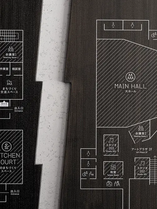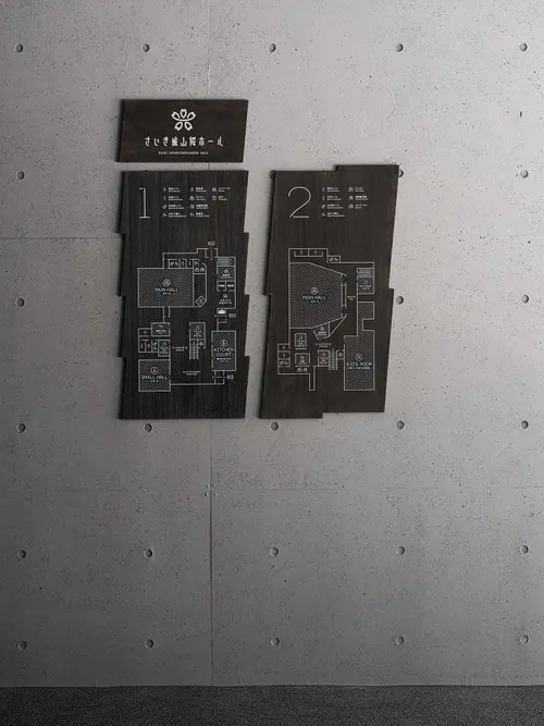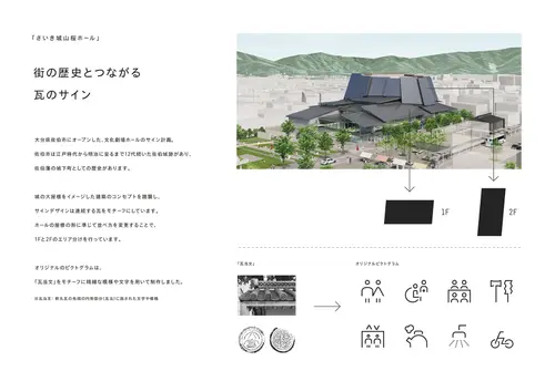 作品意図大分県佐伯市にオープンした文化ホールのサイン計画。佐伯市は江戸時代から明治に至るまで12代続いた佐伯城跡があり、佐伯藩の城下町としての歴史があります。城の大屋根をイメージした建築のコンセプトを踏襲し、サインデザインは連続する瓦をモチーフにしています。