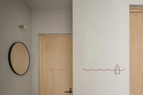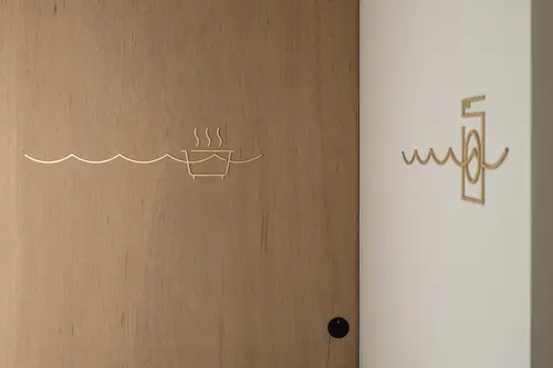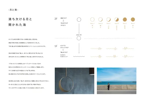 サイン計画では2Fの宿泊エリアは「月」の円を、街に開かれた1Fはその円を5分割した波をモチーフにしています。目の間に広がる青い「海」や、街灯のない暗闇に浮かぶ「月」だけでなく、はっきりと見ることとのできない昼の「月」や夜の「海」を、サインのデザインを通して感じてくれれば良いと考えています。