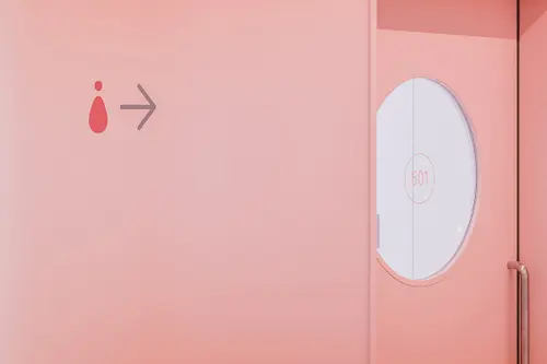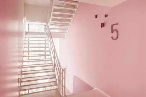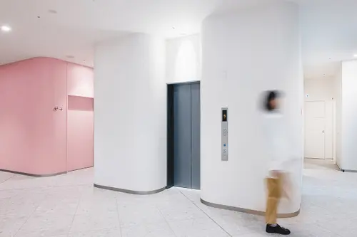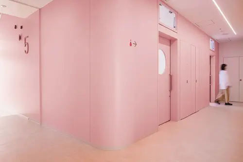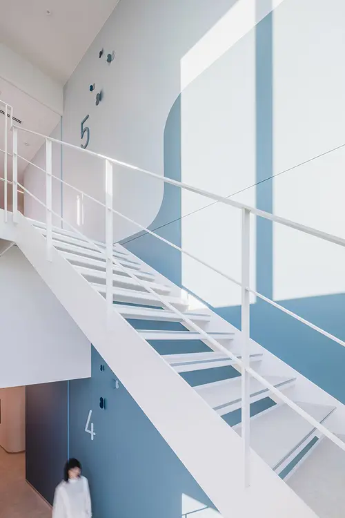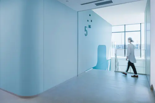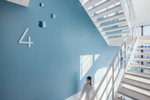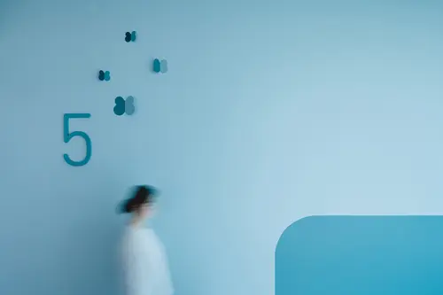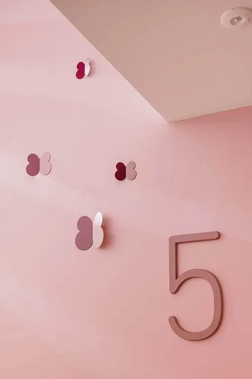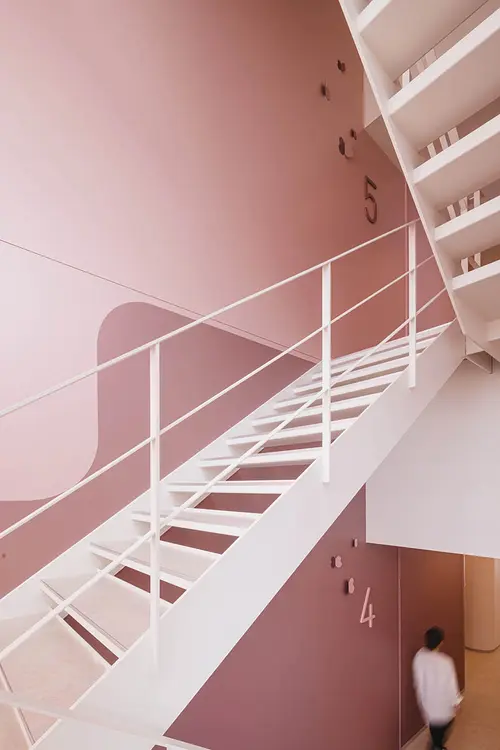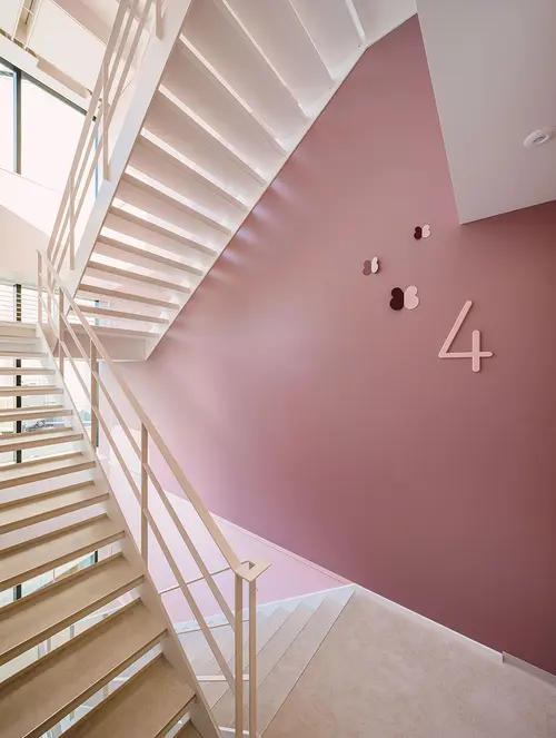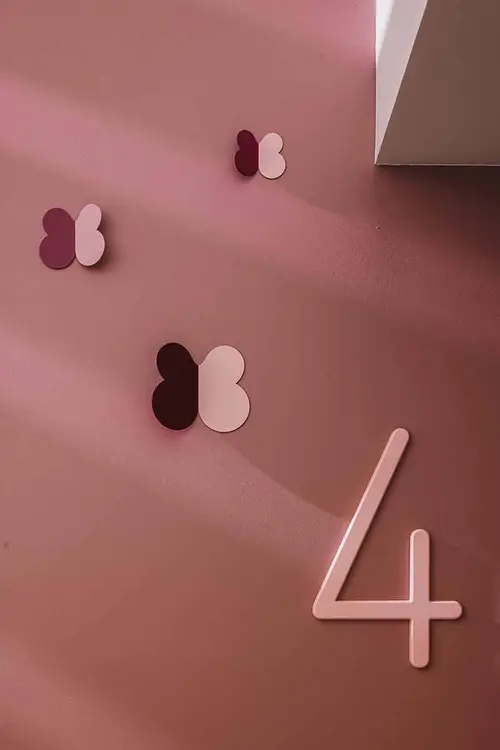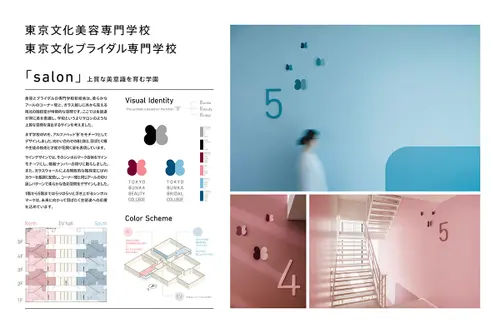 受賞コメント美容とブライダルの専門学校新校舎は、アールのコーナー壁と南北の階段室が特徴的な空間です。生徒達が常に美を意識し、学校というよりサロンのような上質な空間を演出するサインを考えました。VIはアルファベット“B”をモチーフとし、向かい合わせのBとBで、羽ばたく蝶や生徒の技術と才能が花開く姿を表現しています。VI自体をサインモチーフにし、VIカラーを基調に配色した階段室の階数ナンバーの周りに散らしました。