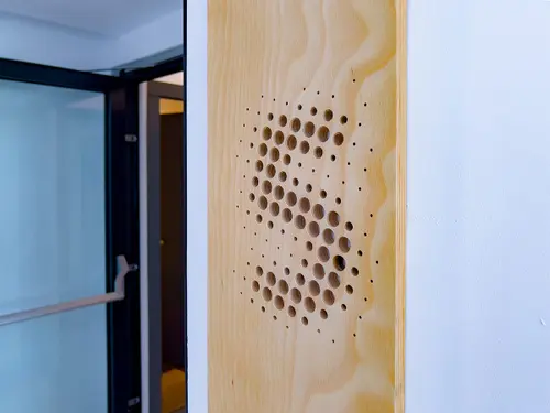 階数表示はルーマニア産木板に自社の電動工具で穴あけしつくられ、