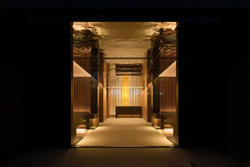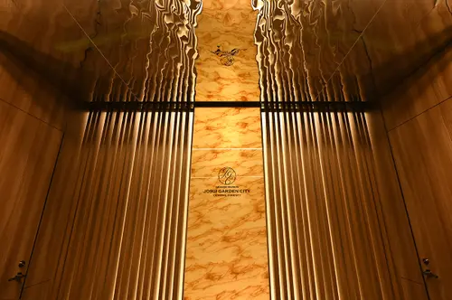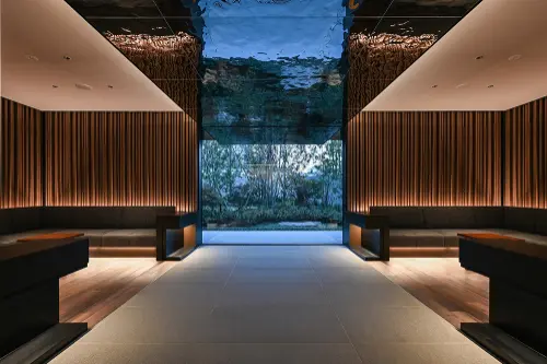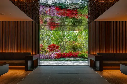 受賞コメント「ともに住まう」福岡市有数の高級住宅地に、約10年におよぶ街づくりを行うプロジェクト。ラウンジの外と内をつなぐ1枚のステンレス波板天井は、季節を映し、しつらえを映すサインとなる。外にいながら内を感じ、内にいながら外を感じられるよう、水平の広がりを垂直に変換するサイン。自然と共にある気づかいが、住まう人の日常を豊かにする。