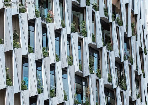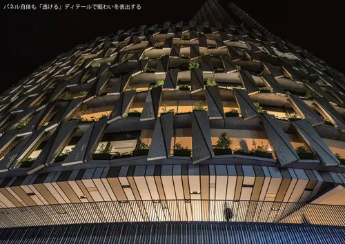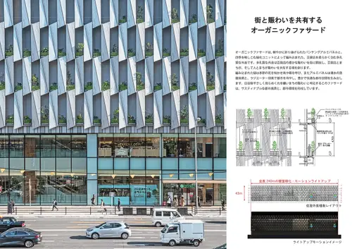 低層部の百貨店を柔らかく包むオーガニックファサードは、軽やかに折り曲げられたパンチングアルミパネルと、四季を映しこむ緑化ユニットによって編み込まれた、多孔質な外皮です。多孔質な外皮は百貨店の豊かな賑わいを街に開放し、百貨店とまちが、そして人とまちが賑わいを共有する場を創ります。