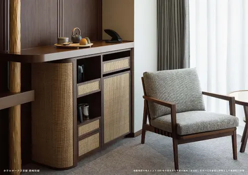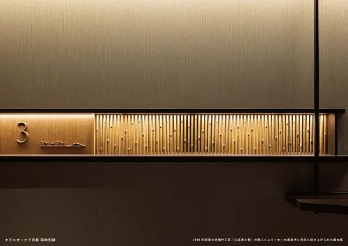 受賞コメント日本の伝統工芸が生産額を減少している中、枠に囚われず挑戦し続ける工芸の後継者達と共創。EVホールでは竹工芸「公長斎小菅」の丹念に磨かれた簾虫籠が客室へ誘い、客室玄関では「開化堂」が創業当時からの製法で制作したルームナンバーを記す茶筒の灯りが出迎える。地域の産業復興や環境への配慮を行い、新たに空間の設えに取り組んだ伝統工芸を多くの方に触れていただくことで、京の工芸を未来へとつなぐホテルを目指した。