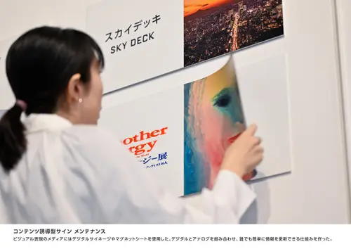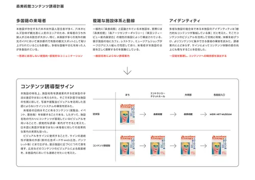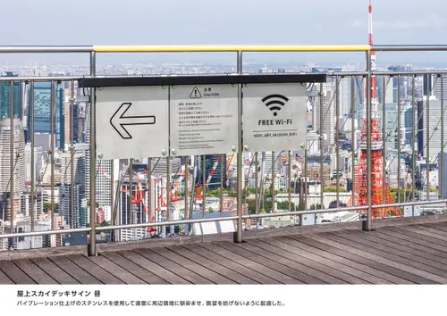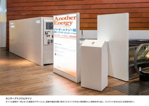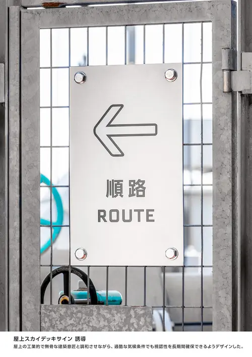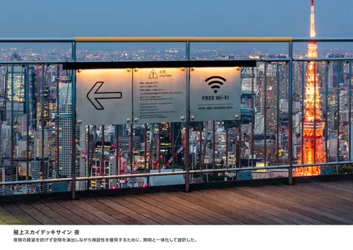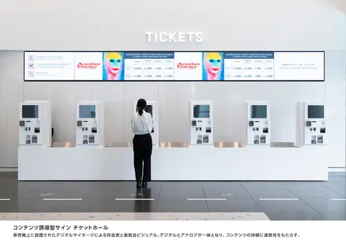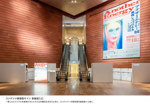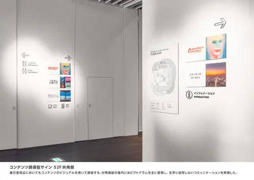 受賞コメント様々な国籍の人が訪れる本施設は複雑に入り組んだ複数の施設で構成されている。本計画では施設の特性を鑑みて、展覧会ビジュアルを活用した言語に頼らないサインシステムの構築した。来場者の目的はコンテンツを体験することである。したがって、コンテンツのビジュアルを用いることで、言語によらない感覚的な誘導を実現するとともに、コンテンツへ期待感を醸成するサインデザインを試みた。