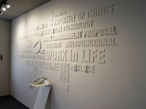 エントランスデザインは、今日の多様化した働き方(サテライト・コワーキングスペース等)を乱立する英単語で表現。