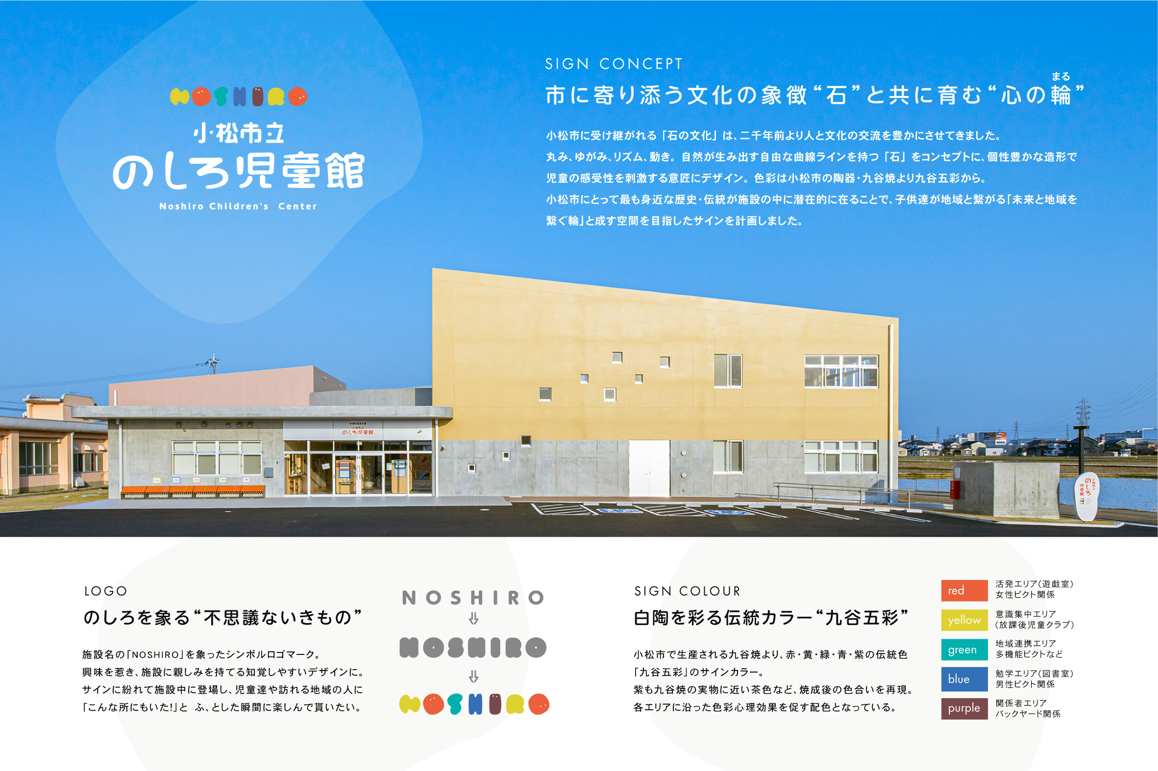 受賞コメントのしろ児童館のサイン計画。小松市に受け継がれる「石の文化」は、二千年前より人と文化の交流を豊かにさせてきました。自然が生み出す自由なラインを持つ「石のシルエット」をコンセプトに、個性豊かな造形で児童の感受性を刺激するデザインに。色彩は九谷焼より九谷五彩から。市にとって最も身近な歴史伝統が潜在的に隣合わせに在る事で、児童と地域が繋がり未来へ継がれる「心の輪」を育む空間を目指したサインを計画しました。