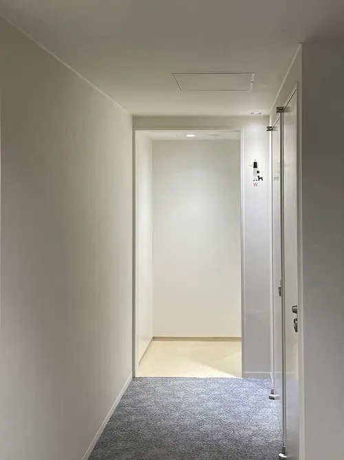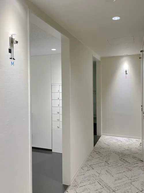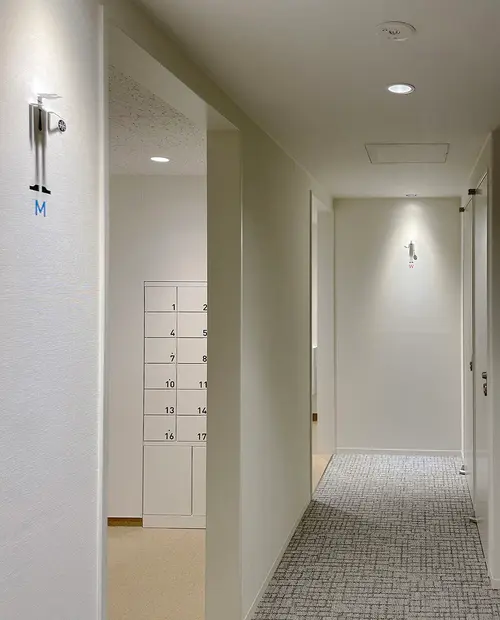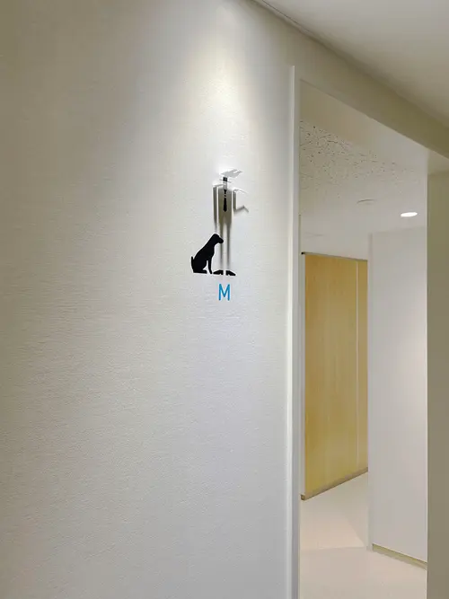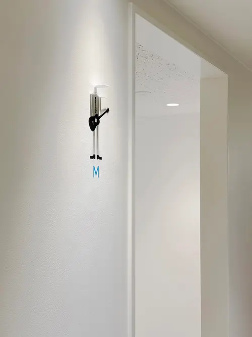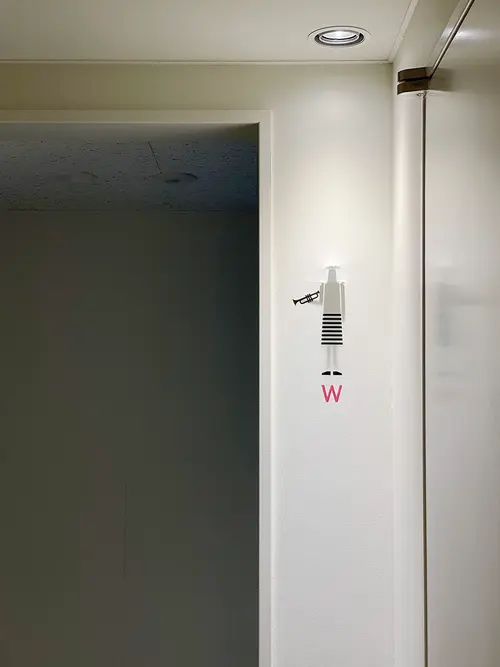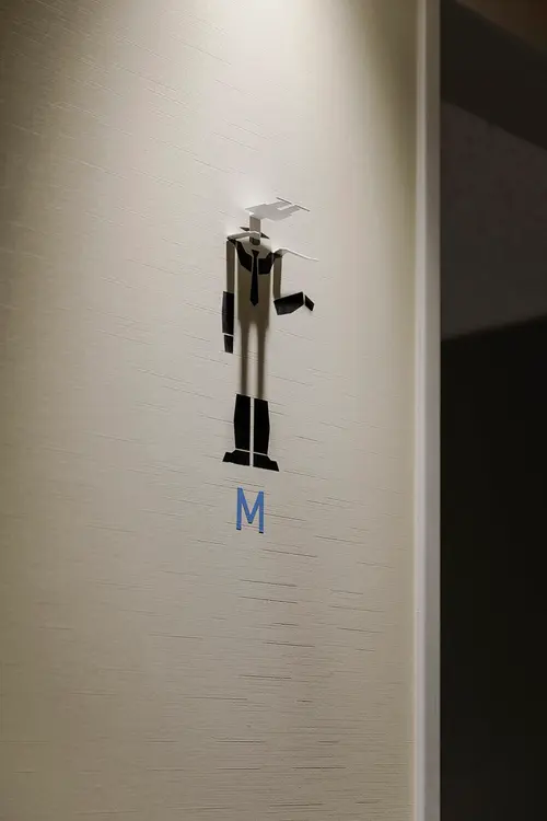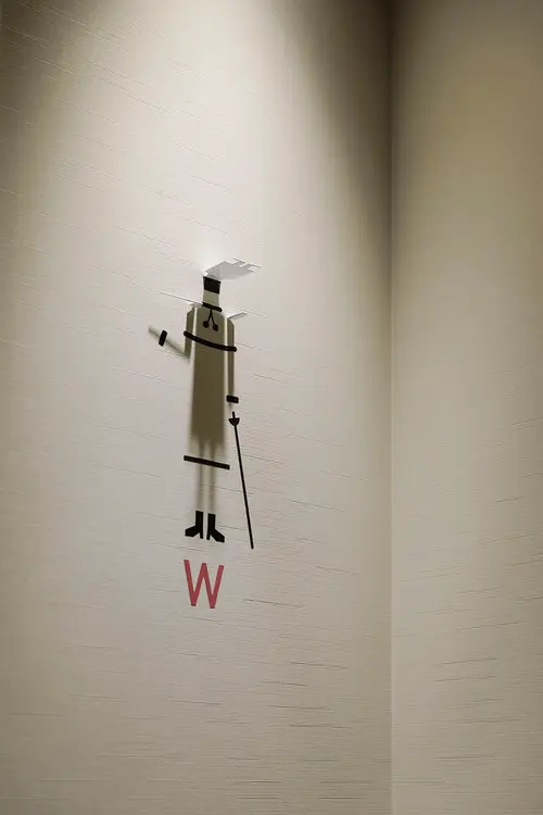 画一的になりがちなトイレのピクトグラムを、通路の照明器具を利用した影絵とカッティングシートの組み合わせによって、多様に変化させることができます。