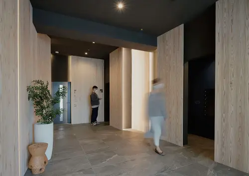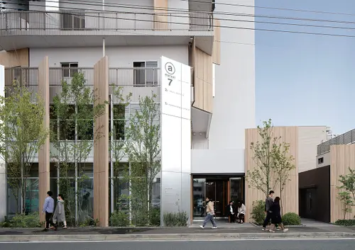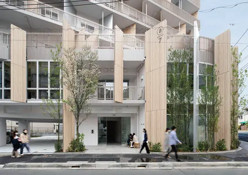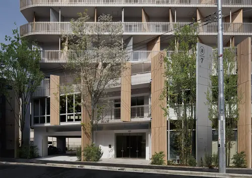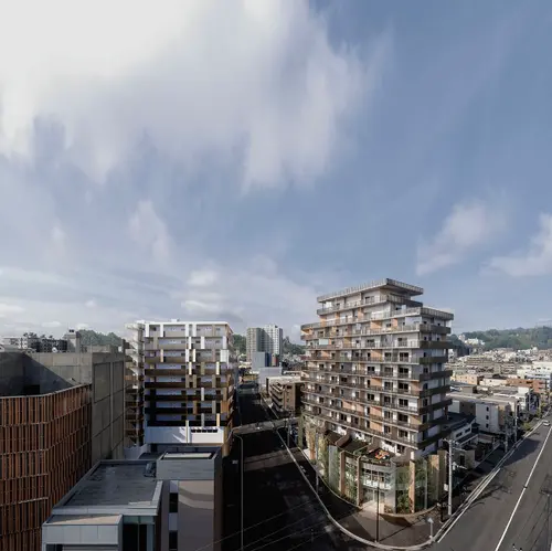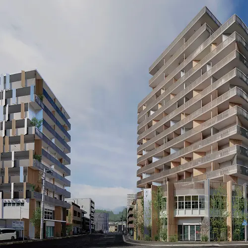 受賞コメント登戸駅前の再開発エリアにおける、店舗付集合住宅。新たな道路開通を見通し、通りのシークエンスに配慮した共通のデザイン手法で、道路を挟んだ2棟を構築した。建物が多摩川と生田緑地の間に位置することから、水面の揺らめきを表現し風景を写し込む高輝アルミと、木の香りや温もりのある杉板のパネルを隔て板に採用。登戸の風景を外観デザインに取り込んだ。さらに隔て板をサインの媒体とし、街と調和する新たな景観を創出した。