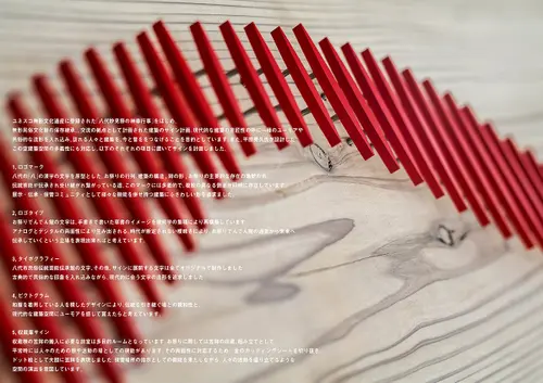 受賞コメントユネスコ無形文化遺産に登録された「八代妙見祭の神幸行事」をはじめ,無形民俗文化財の保存継承、交流の拠点として計画された建築のサイン計画。現代的な建築の意匠性の中に一種のユーモアや民俗的な造形を入れ込み、訪れる人々と建築を、今と昔ををつなげることを目的としています。建築の外の壁面や、保管庫に対しても収蔵されている品物の図像をサインとして取り入れ、お祭りの様子をより近く感じ取れるように試みています。