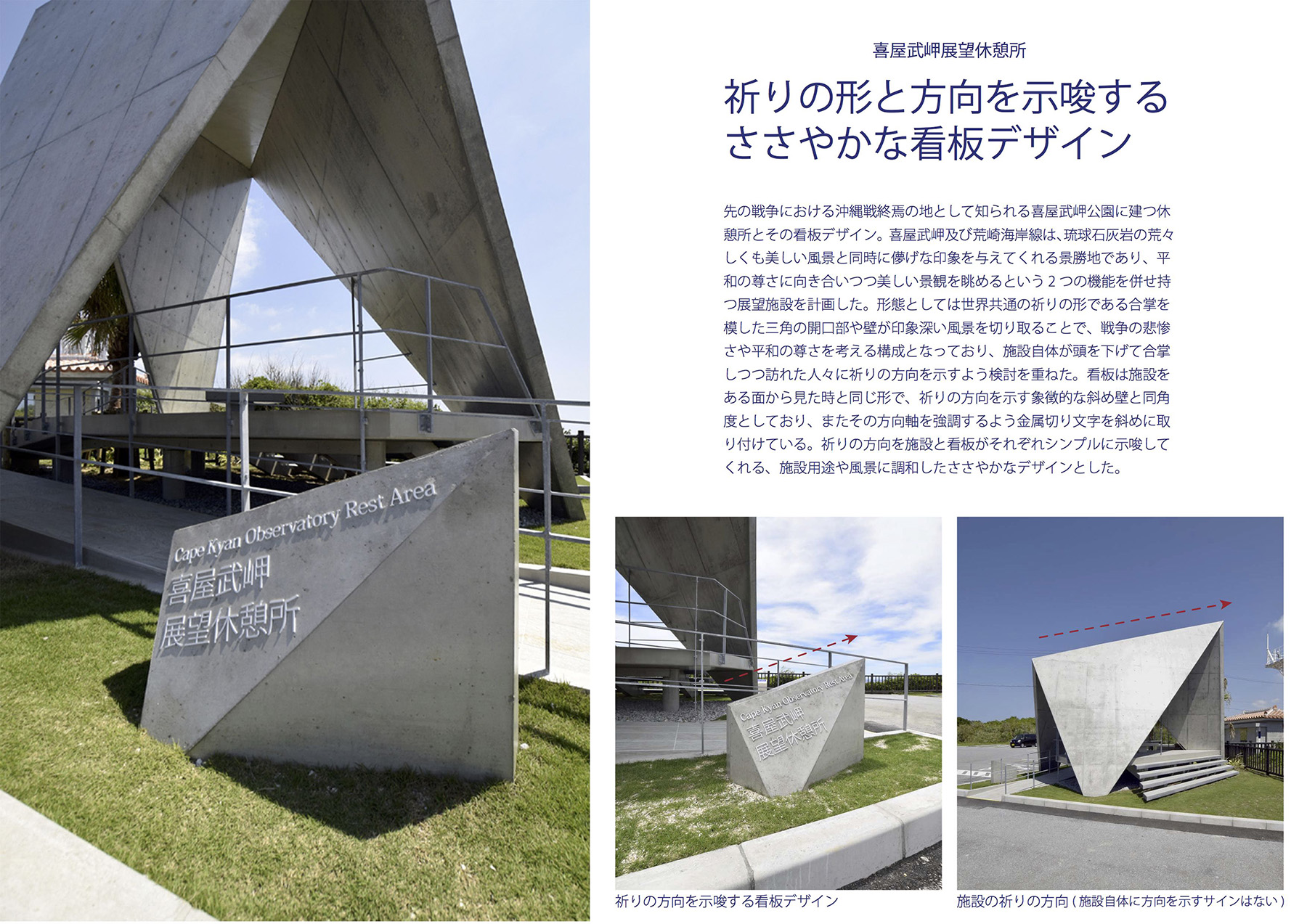 受賞コメント沖縄戦終焉の地である喜屋武岬公園に建つ休憩所とその看板デザイン。祈りの形である合掌を模した三角の開口部や壁が印象深い風景を切り取ることで、戦争の悲惨さや平和の尊さを考える計画となっており、施設自体が頭を下げて合掌しつつ訪れた人々に祈りの方向を示すよう計画した。看板は施設をある面から見た時と同じ形で祈りの方向を示唆しており、施設用途や風景に調和したささやかなデザインとした。