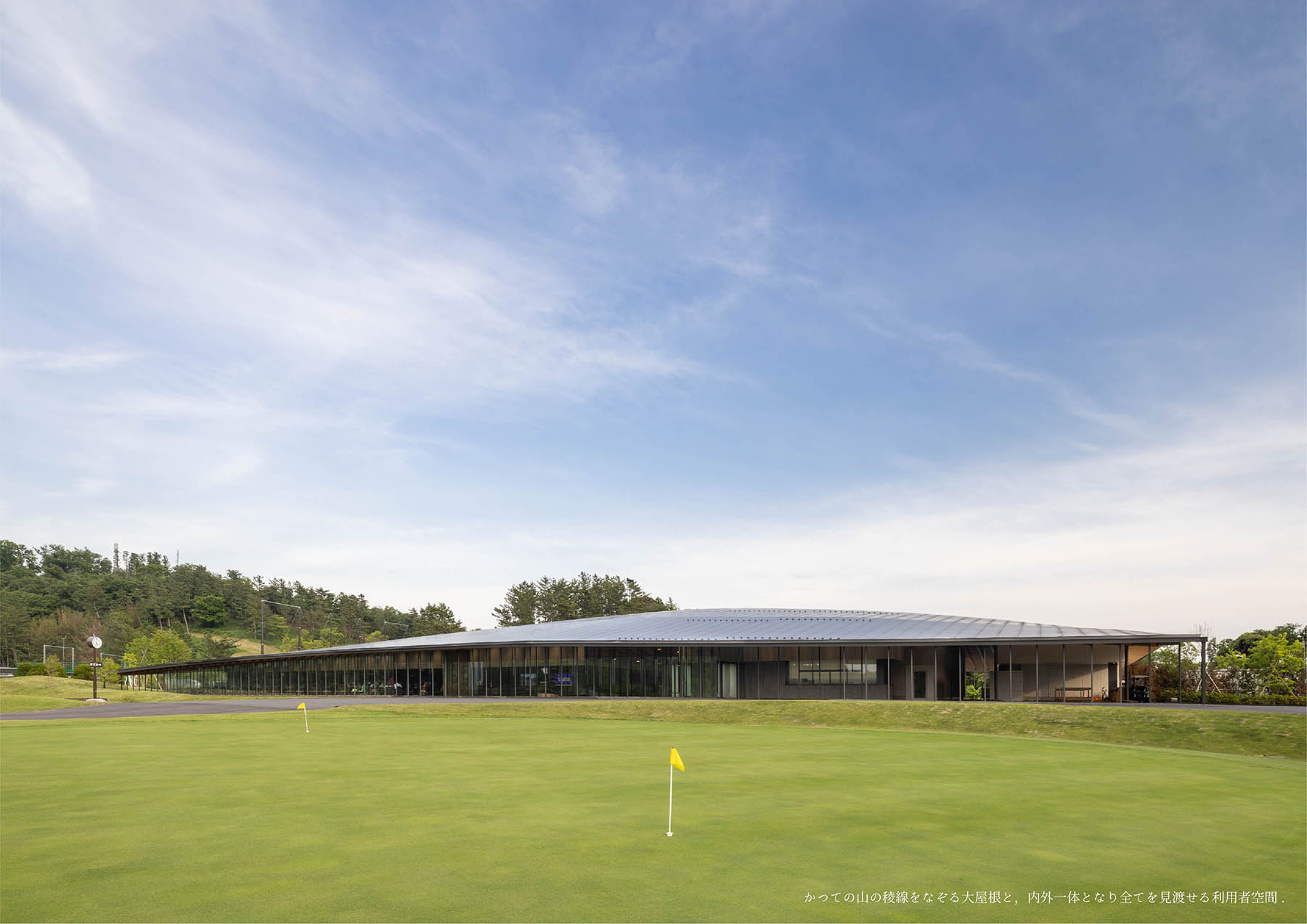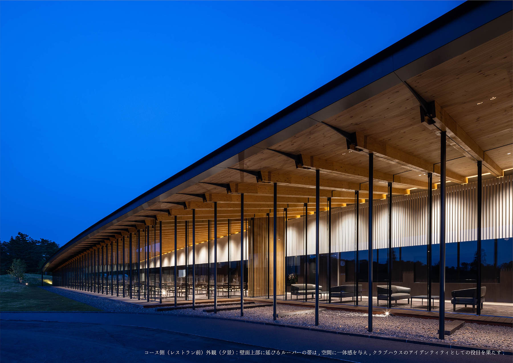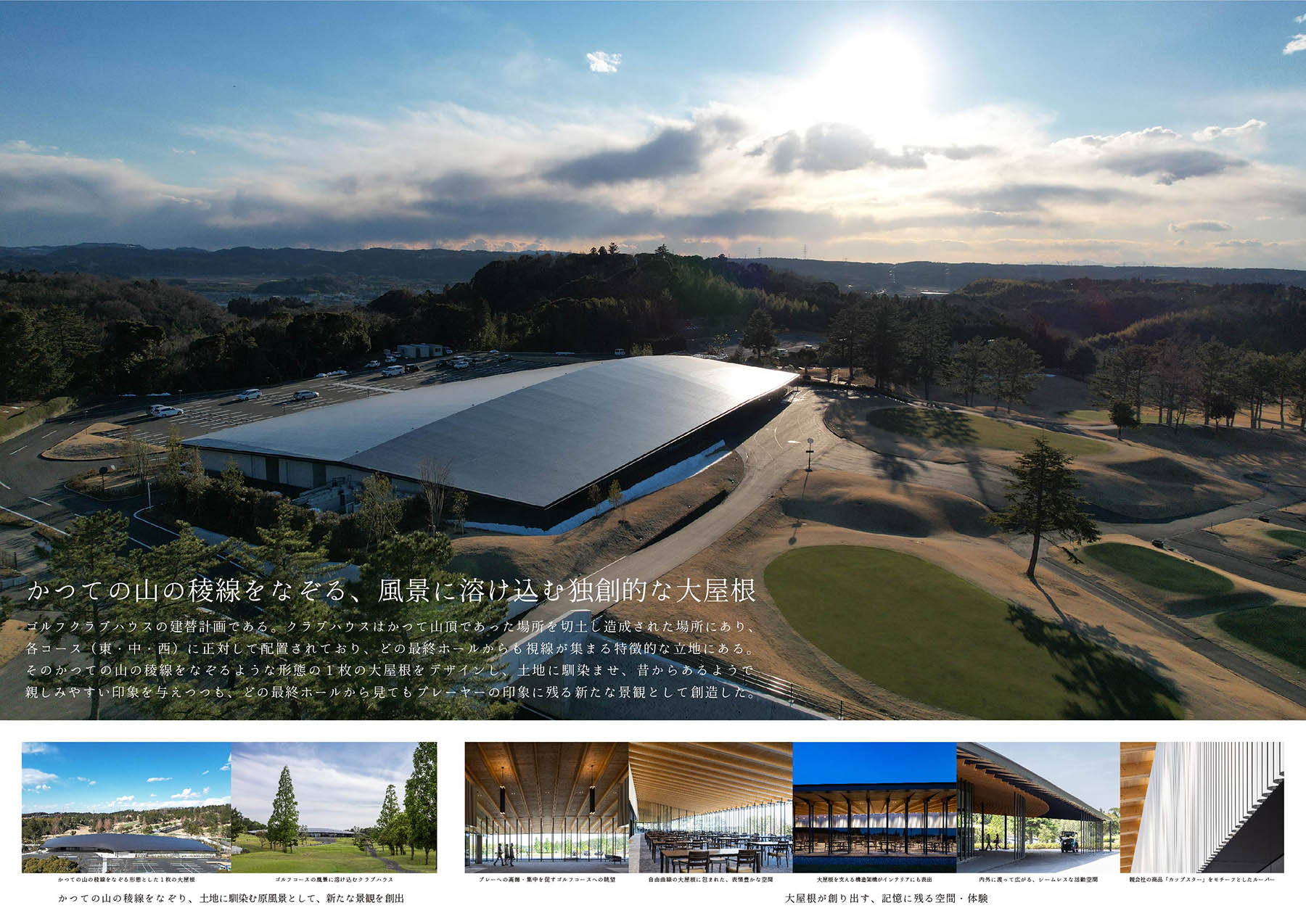 受賞コメント山頂に位置し切土造成により建設されたクラブハウスの建替である。各スタートホール(東・中・西)に正対し、どのホールからも視線が集まる特徴的な立地にある。かつての山の稜線をなぞる形態の大屋根は、地に馴染む原風景として、新たな景観の創出を意図した。その自由曲線による大屋根のワンルーム空間は、内外をシームレスに繋ぎ、木やルーバーによる独自性により、記憶に残るクラブハウス体験を提供している。