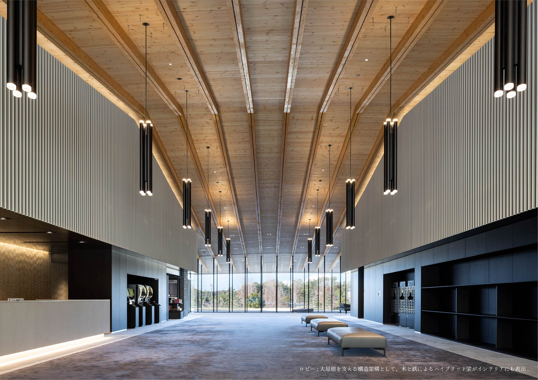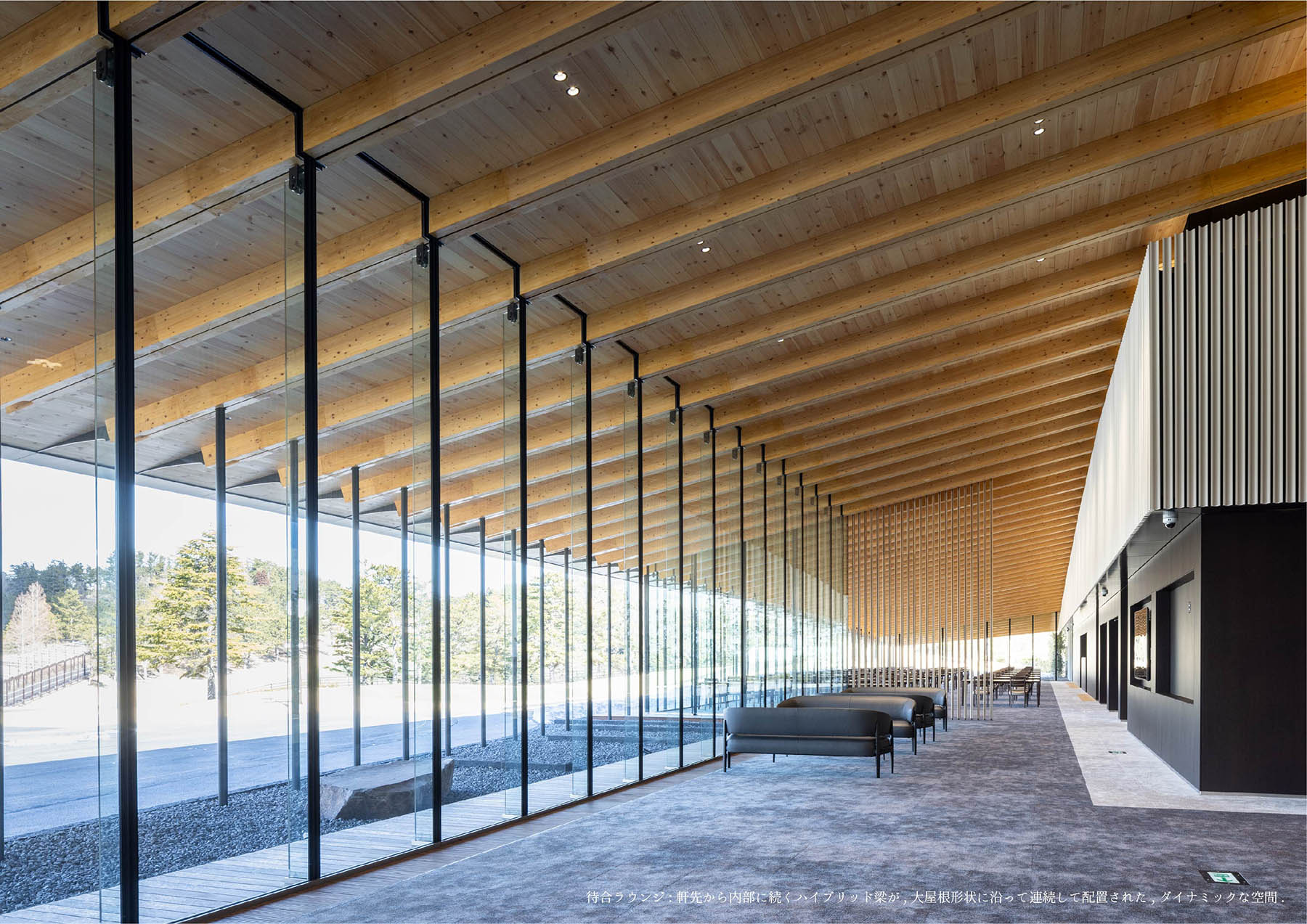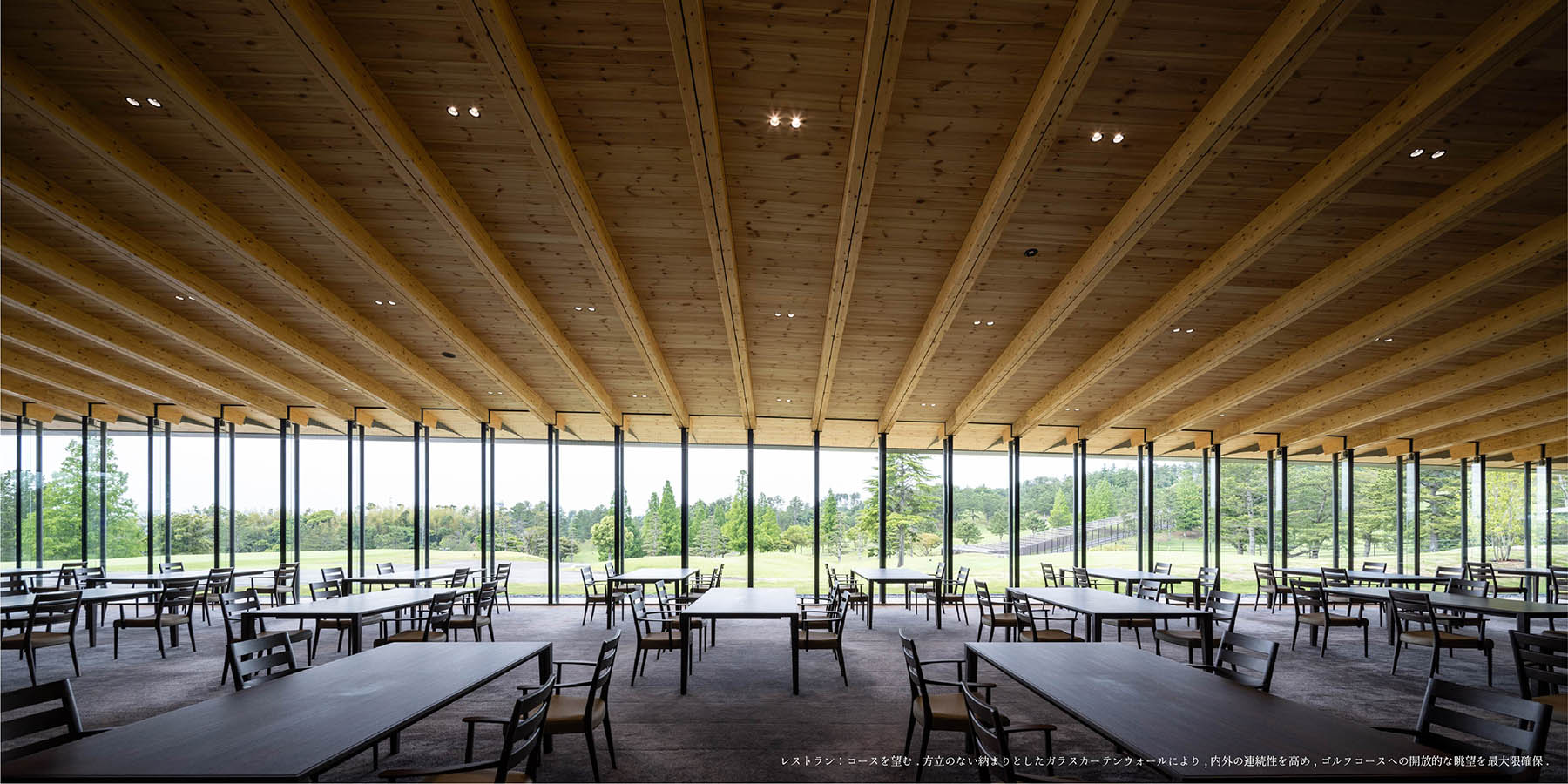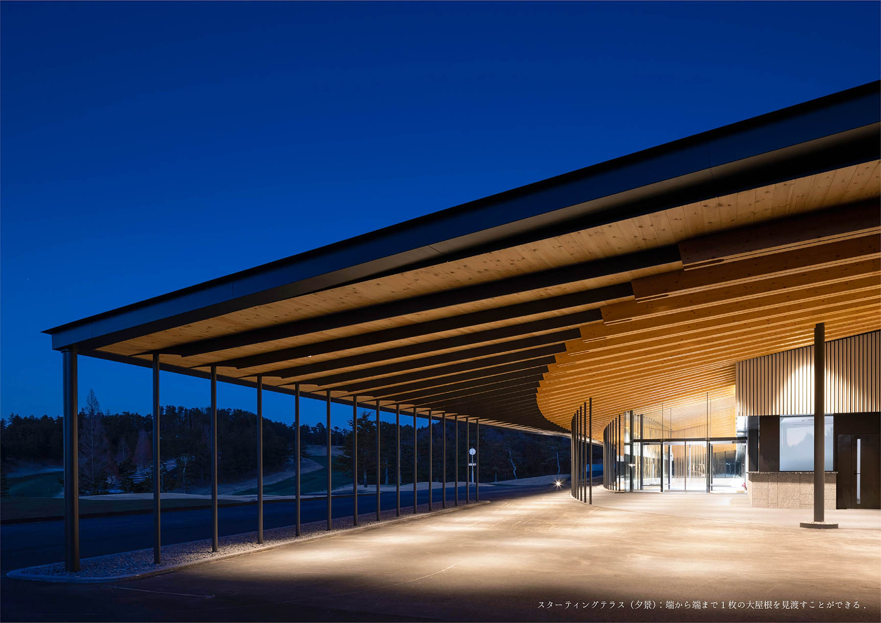 受賞コメント山頂に位置し切土造成により建設されたクラブハウスの建替である。各スタートホール(東・中・西)に正対し、どのホールからも視線が集まる特徴的な立地にある。かつての山の稜線をなぞる形態の大屋根は、地に馴染む原風景として、新たな景観の創出を意図した。その自由曲線による大屋根のワンルーム空間は、内外をシームレスに繋ぎ、木やルーバーによる独自性により、記憶に残るクラブハウス体験を提供している。