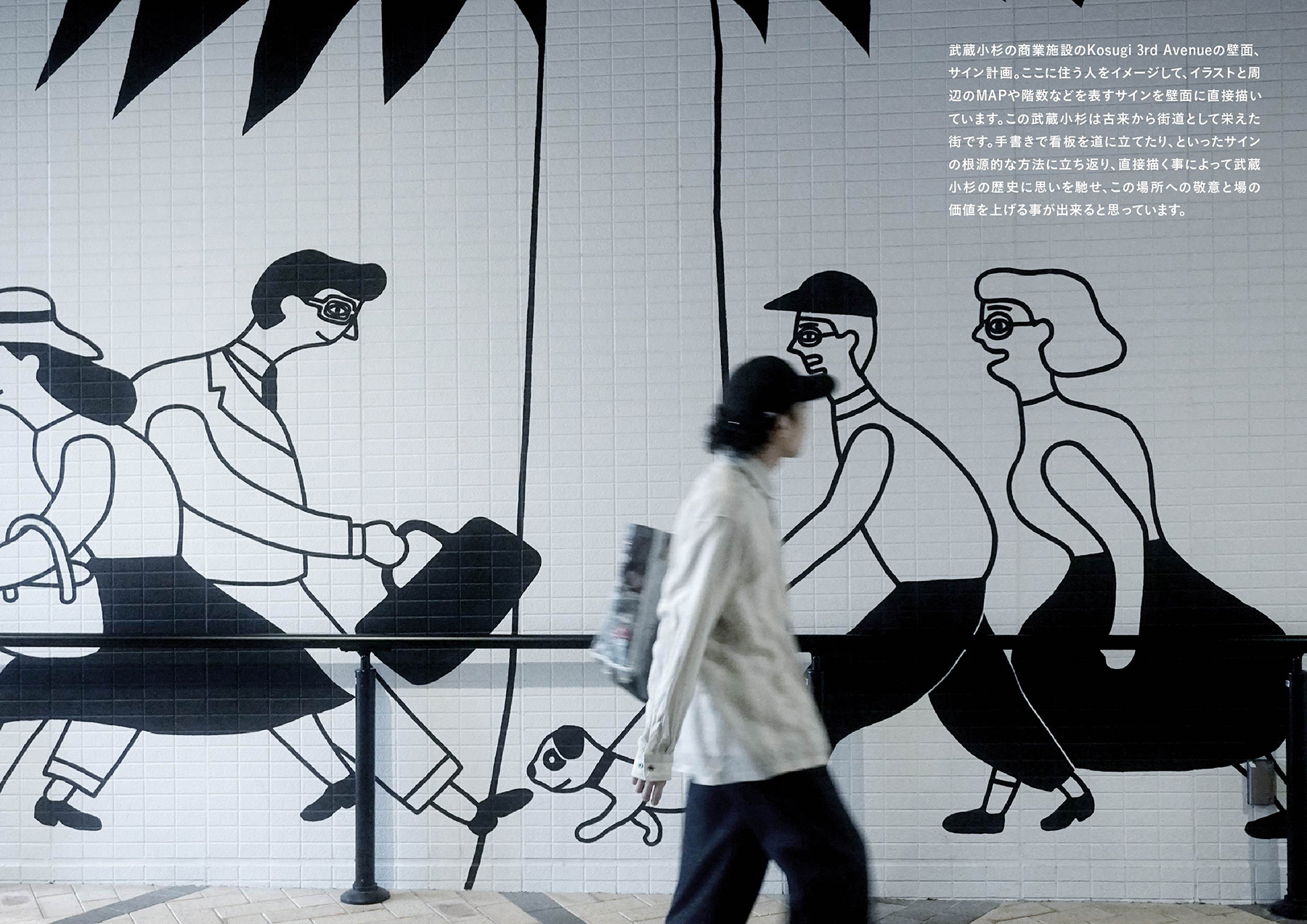 受賞コメント武蔵小杉の商業施設のKosugi 3rd Avenueの壁面、サイン計画。ここに住う人をイメージして、イラストと周辺のMAPや階数などを表すサインを壁面に直接描いています。そもそも、サインというのは、手書きで看板を道に立てたりしていたと思うので、この武蔵小杉は古来から街道として栄えた街なので、サインも直接描く事でこの場所への敬意と場の価値を上げる事が出来ると思っています。
