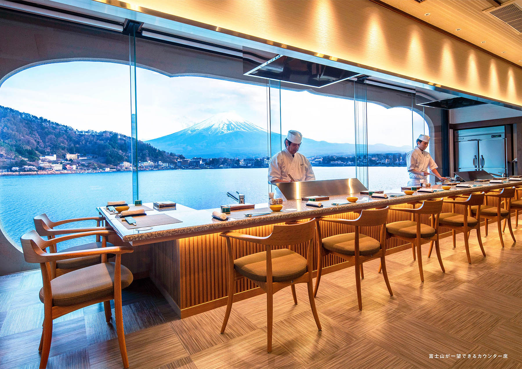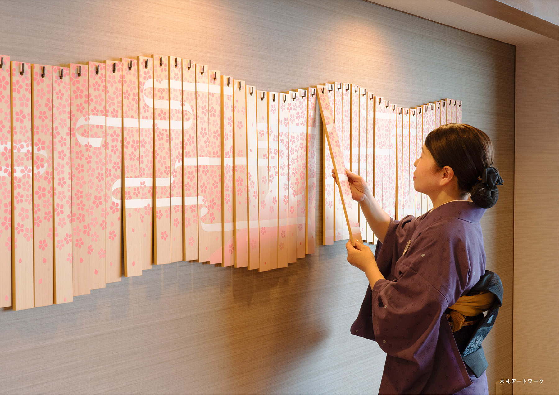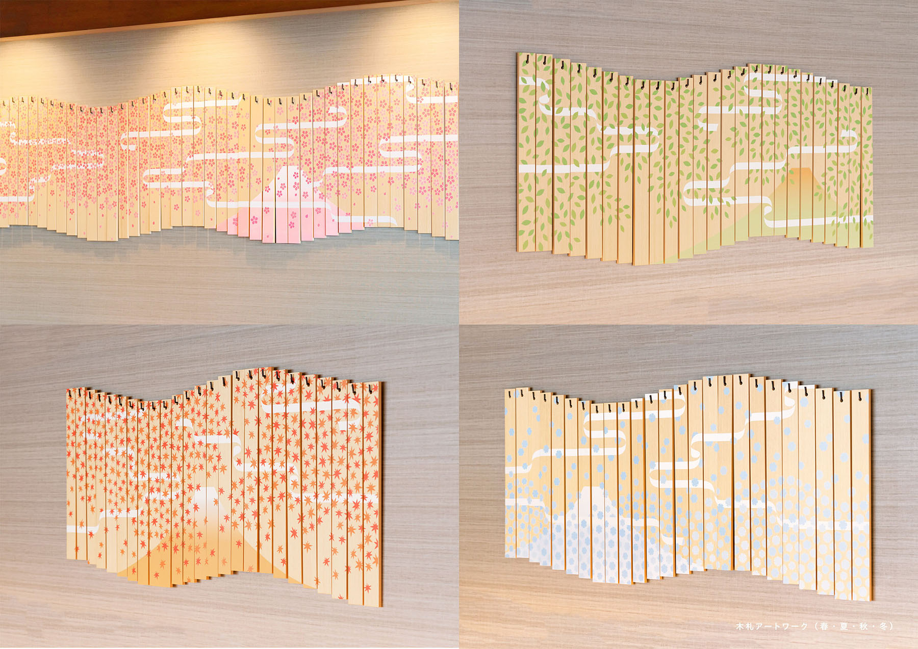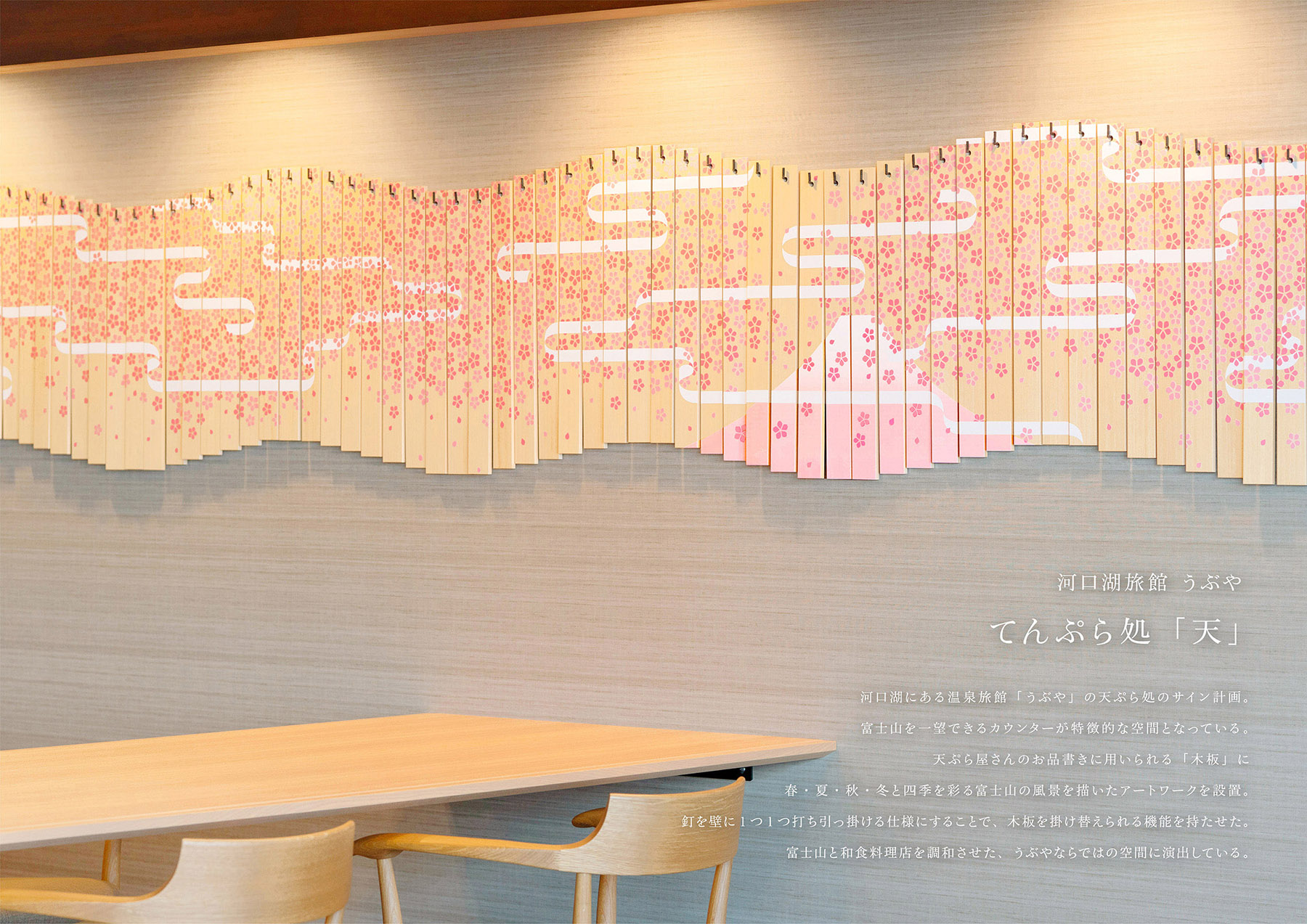 受賞コメント河口湖にある温泉旅館「うぶや」の天ぷら処のサイン計画。 富士山を一望できるカウンターが特徴的な空間となっている。 天ぷら屋さんのお品書きに用いられる「木板」に 春・夏・秋・冬と四季を彩る富士山の風景を描いたアートワークを設置。 釘を壁に1つ1つ打ち、引っ掛ける仕様にすることで、木板を掛け替えられる機能を持たせた。 富士山と和食料理店を調和させた、うぶやならではの空間に演出している。