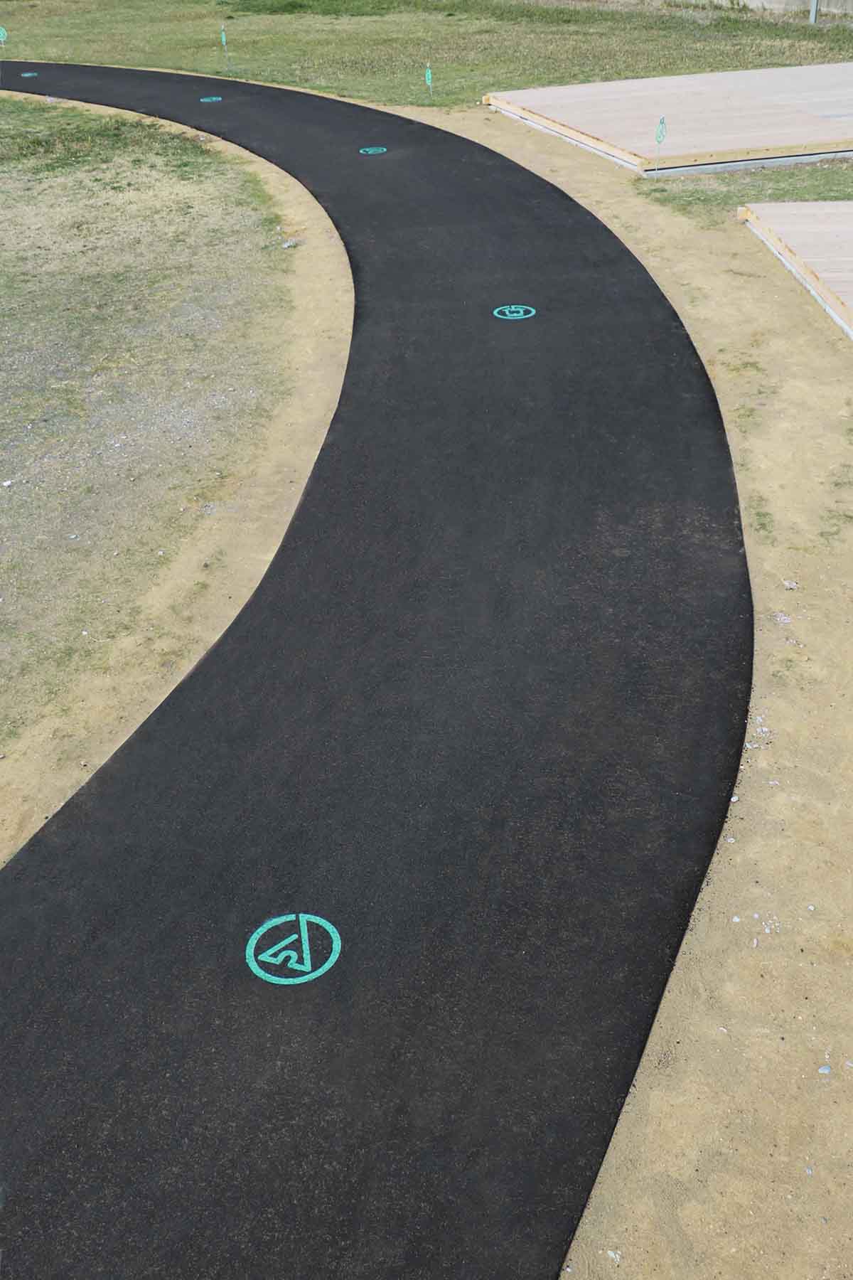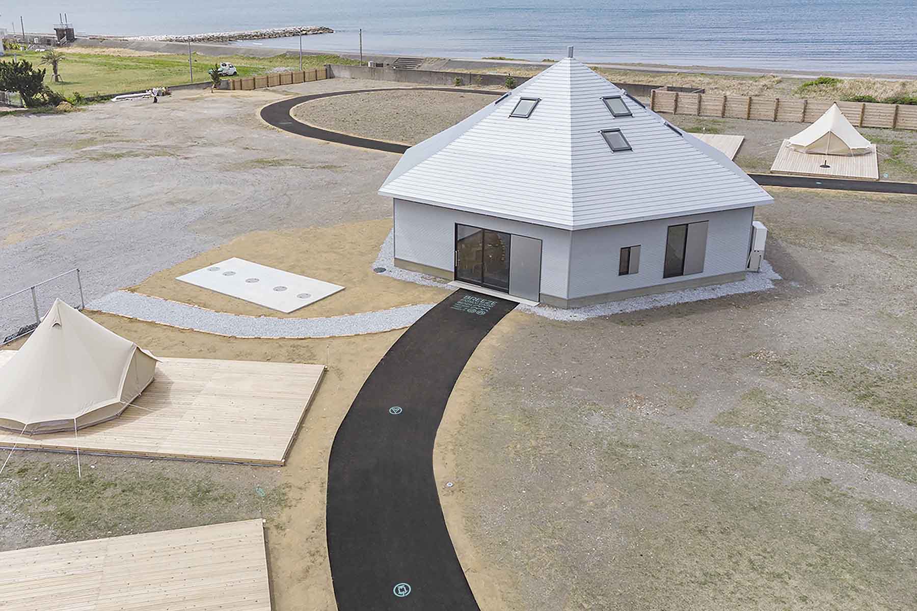 受賞コメント海沿いにあるキャンプ場のサイン計画。管理棟を中心に渦巻状に広がる特徴的な通路を軸に各エリアが配置されている。