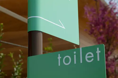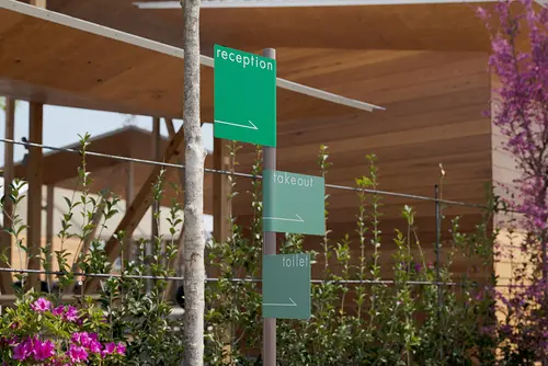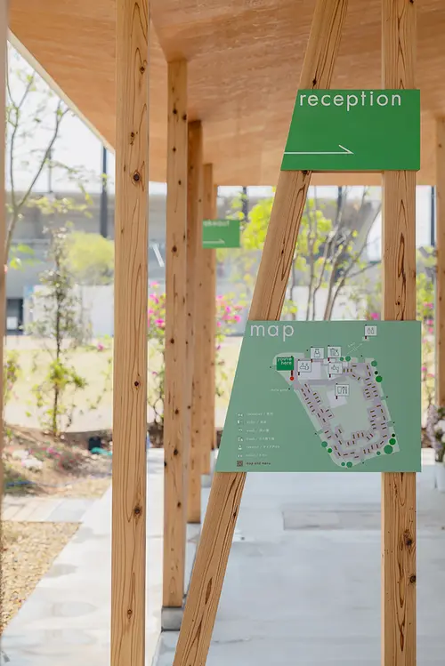 木々と建築が混ざり合う施設に馴染むように屋根・柱・筋交いをモチーフにVIをデザインし、サインデザインも建築に合わせてデザインを進めた。