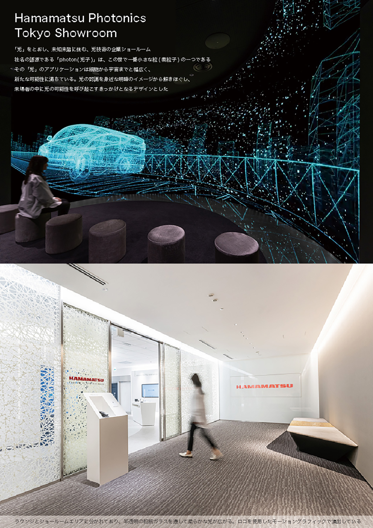 受賞コメント「光」をとおし、未知未踏に挑む、光技術の企業ショールーム。社名の語源である「photon(光子)」は、この世で一番小さな粒(素粒子)の一つである。その「光」のアプリケーションは細胞から宇宙までと幅広く、新たな可能性に満ちている。光の認識を身近な明暗のイメージから解きほぐし、来場者の中に光の可能性を呼び起こすきっかけとなるデザインとした。