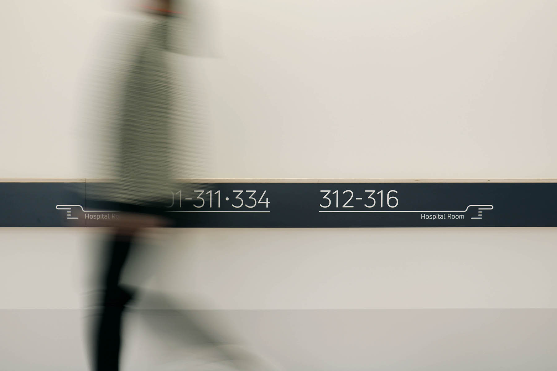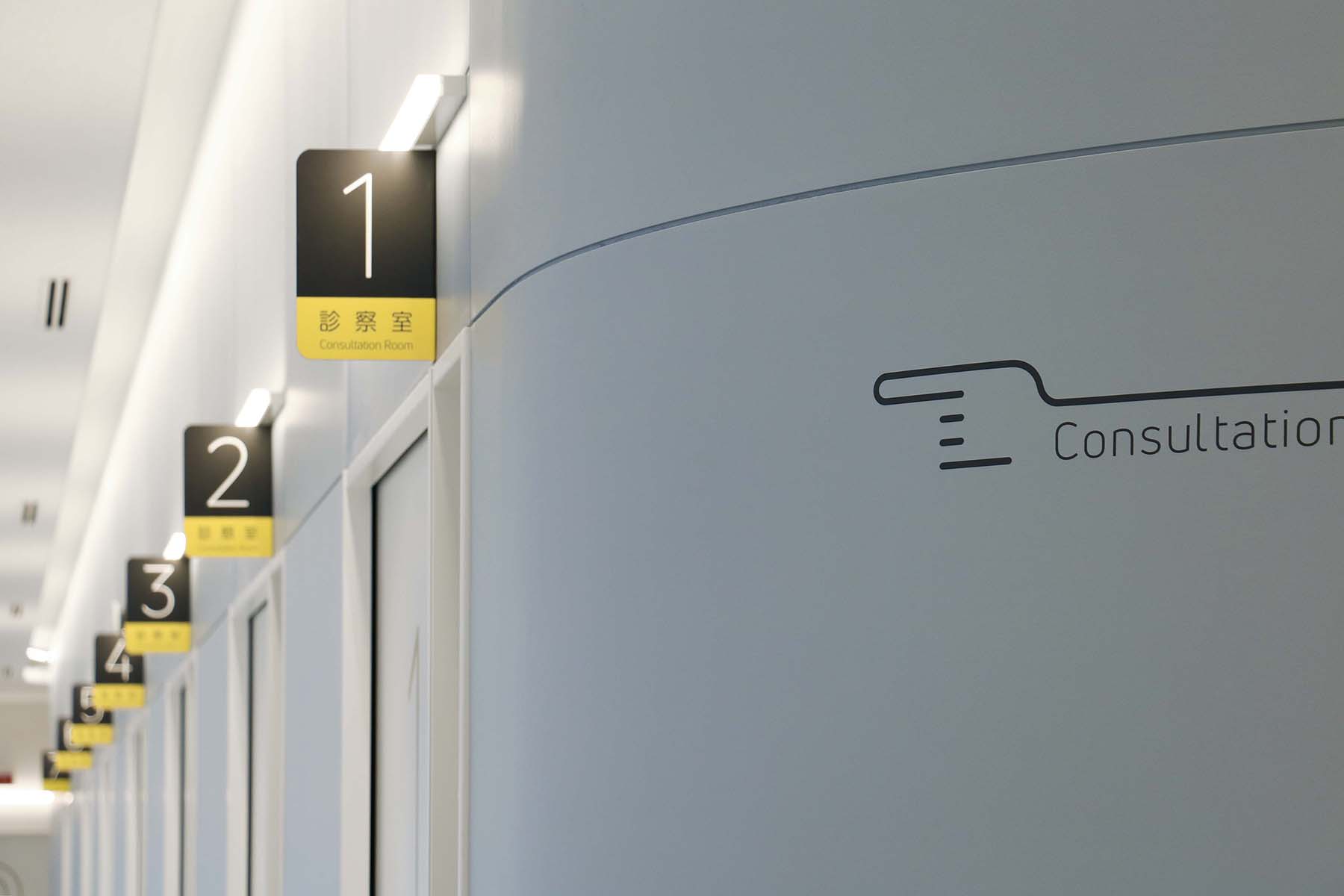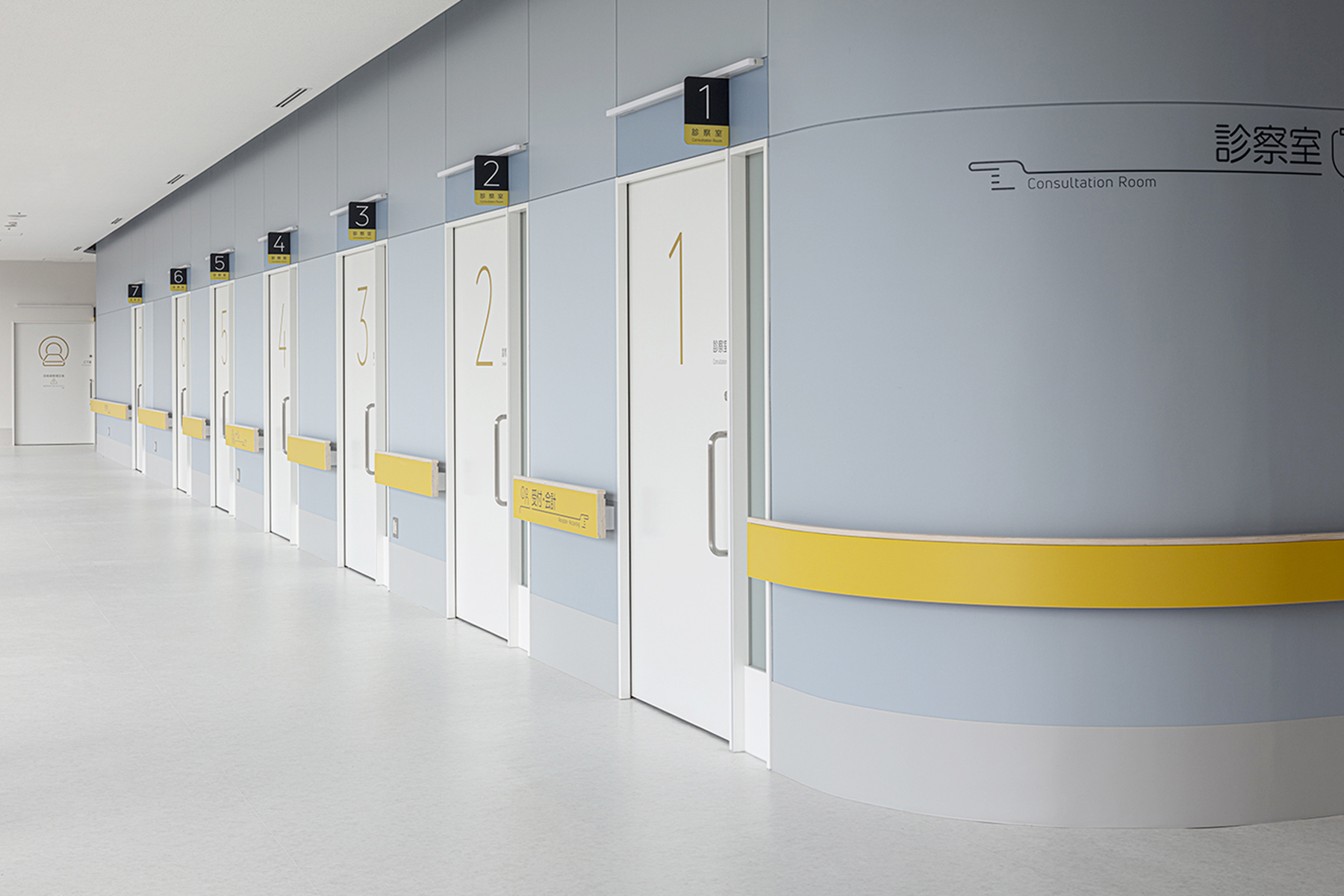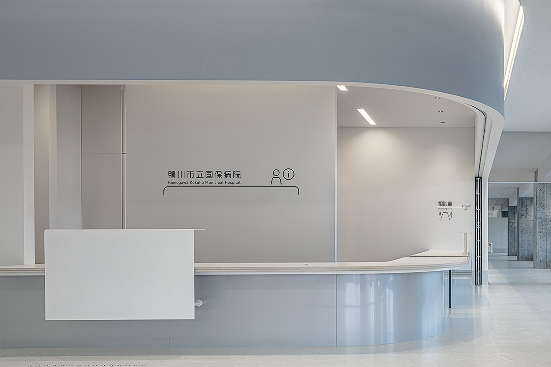 受賞コメント鴨川市立国保病院のサイン計画。1階外来はスタッフエリアを包み込むブルーグレーの皮膜壁を中心に構成され、2・3階は病棟になっている。