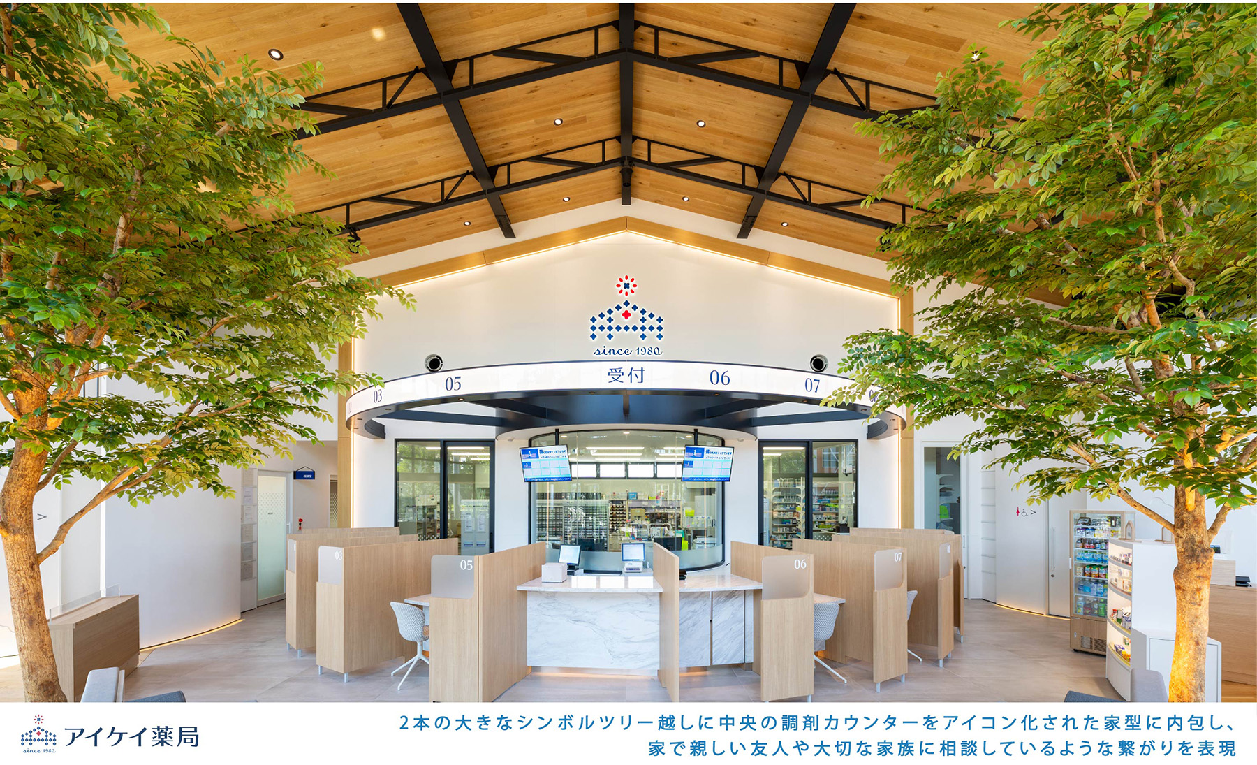受賞コメント地域の健康を見守る「みんなの和が家」をコンセプトに掲げる調剤薬局。 通常機能に加え、個別相談、健康教室等様々な機能を有す。親しい友人や家族に相談するかのように、薬剤師・スタッフと来局者、そして来局者同士がふれ合う地域の「ワガヤ」を視覚化した。 デンマーク語の 「ヒュッゲ」に表される開放的で満たされた精神を、フレメ織からヒントを得てデザインに織り込んだ。屋根の上には暗闇に灯る一番星が輝いている。