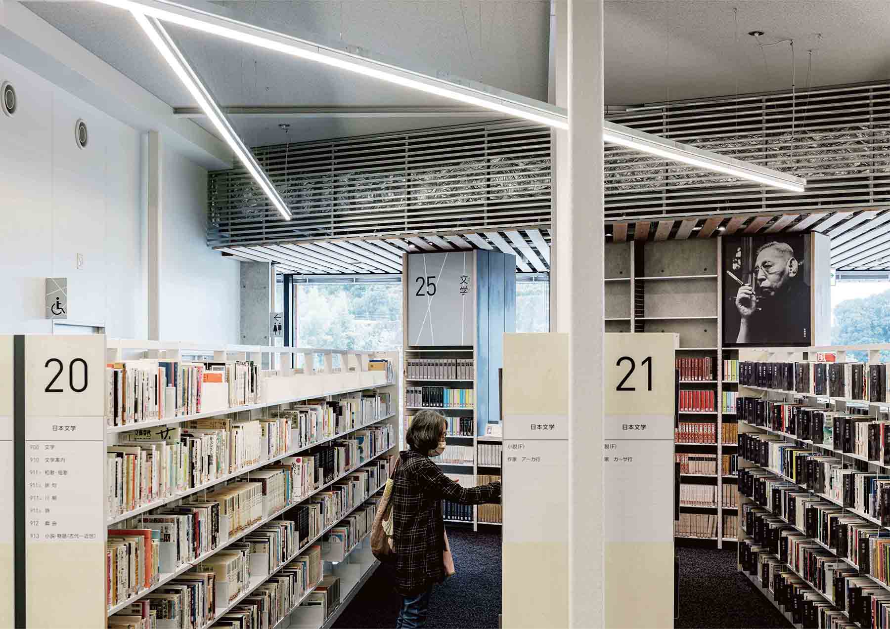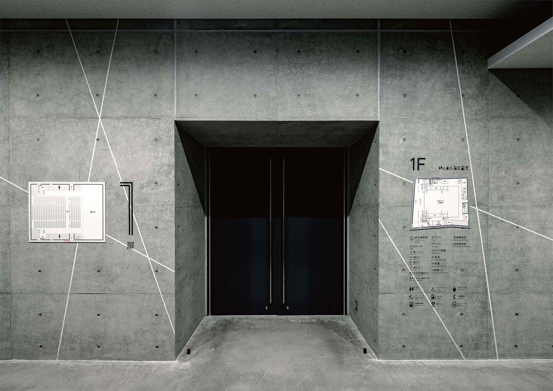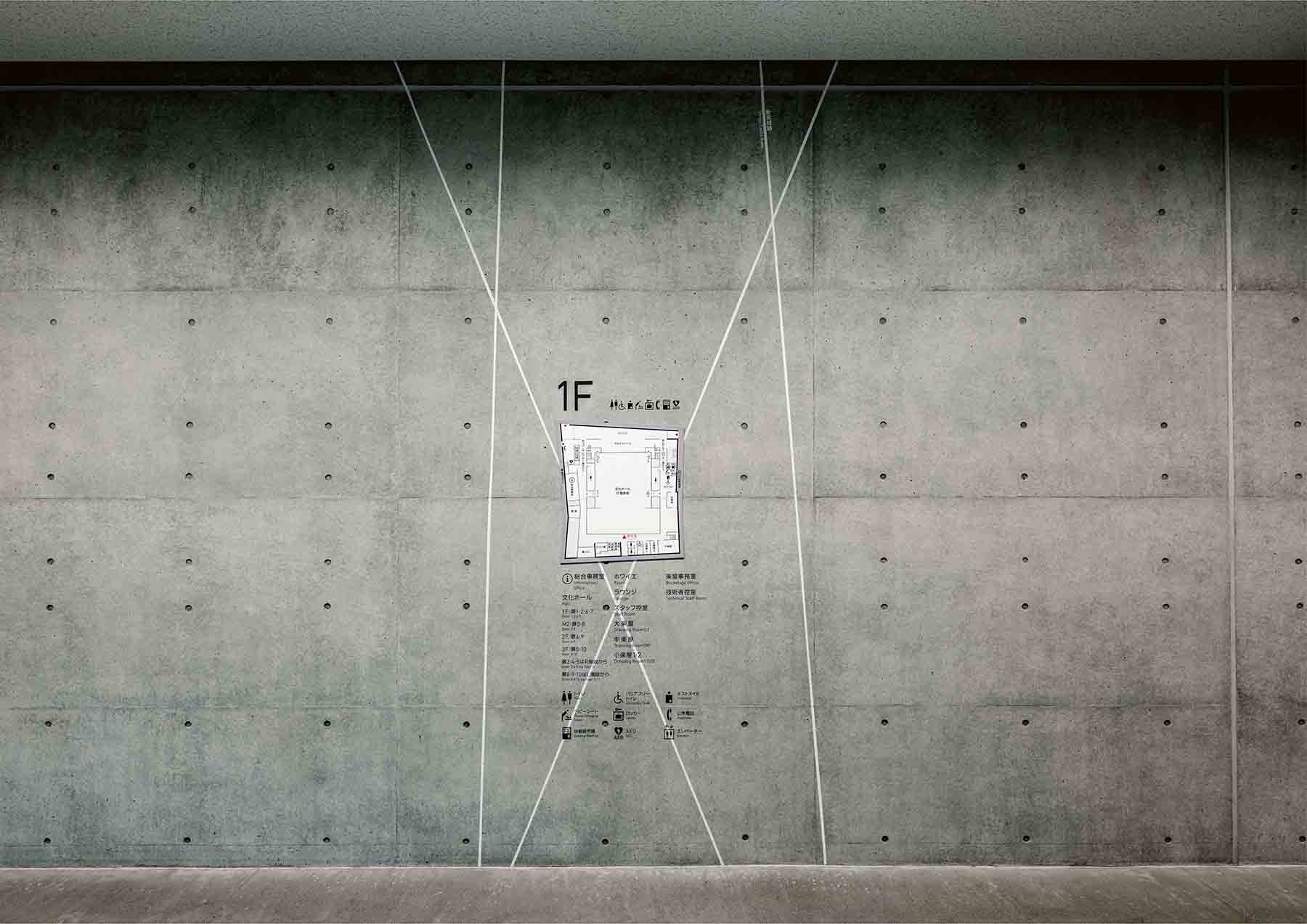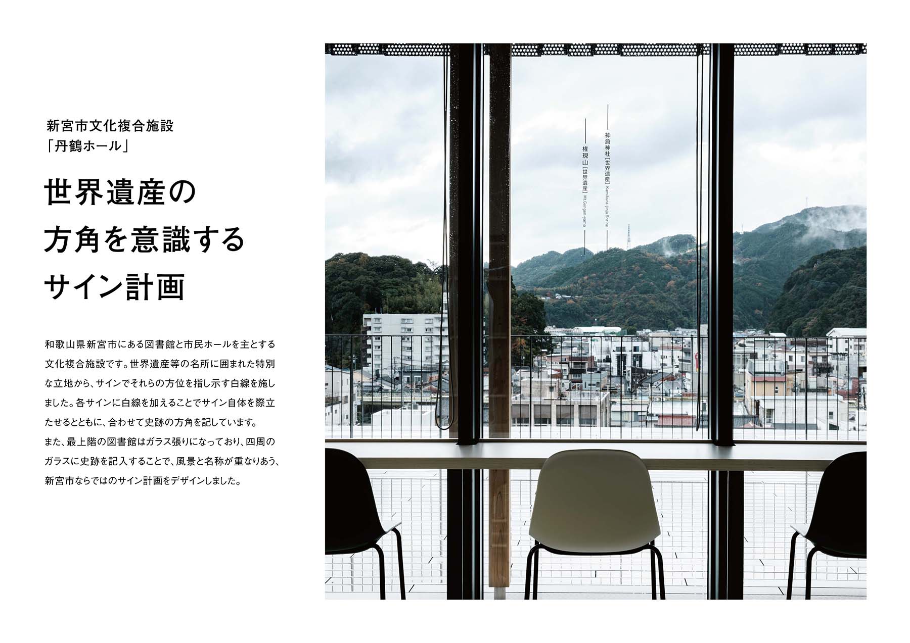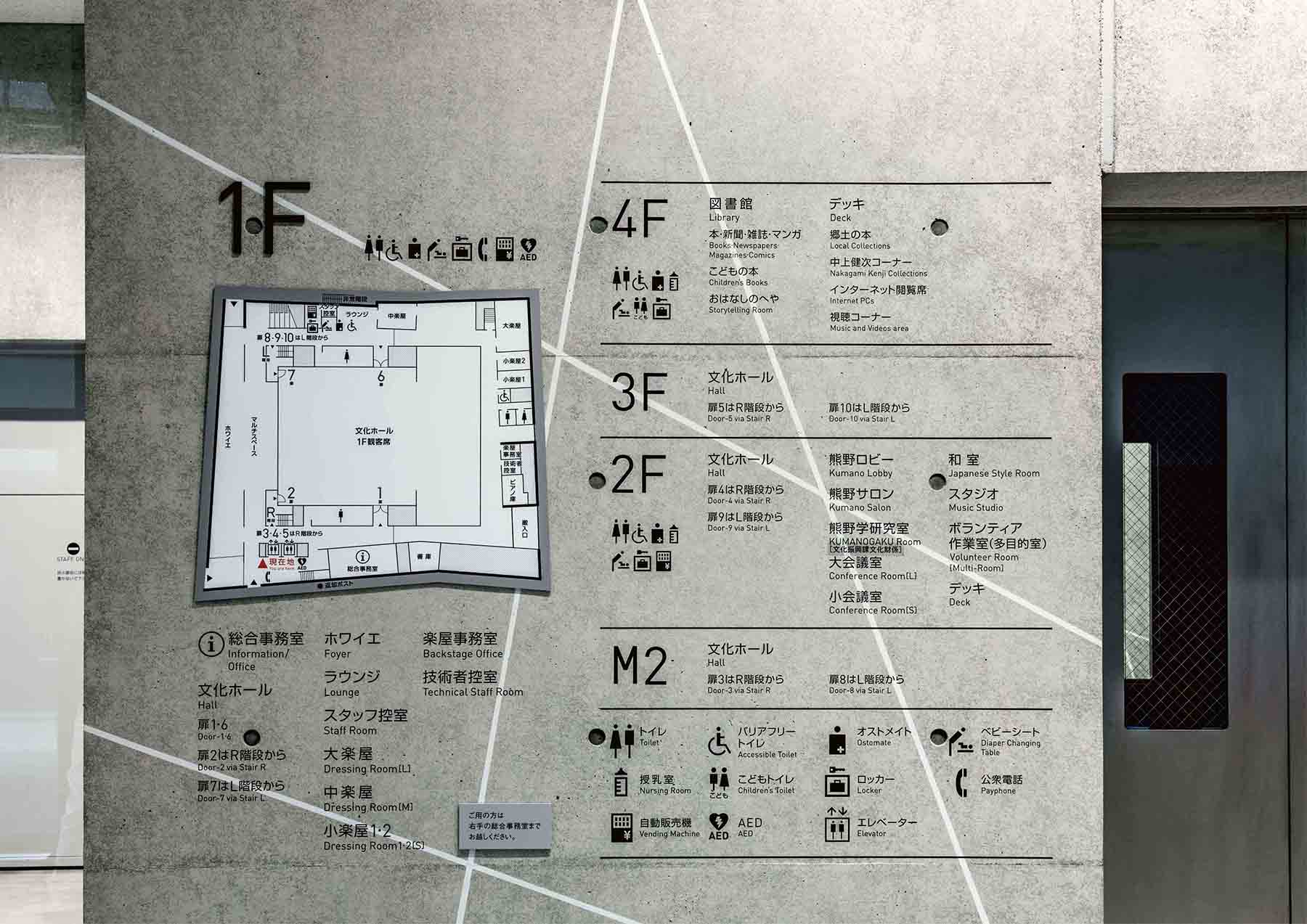 和歌山県新宮市にある図書館と市民ホールを主とする文化複合施設。世界遺産等の名所に囲まれた特別な立地から、サインでそれらの方位を指し示す白線を施しました。白線でサイン自体を際立たせると共に、史跡の方角を記しています。最上階の図書館はガラス張りになっており、四周のガラスに史跡を記入することで、風景と名称が重なりあう、新宮市ならではのサイン計画をデザインしました。