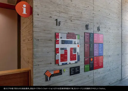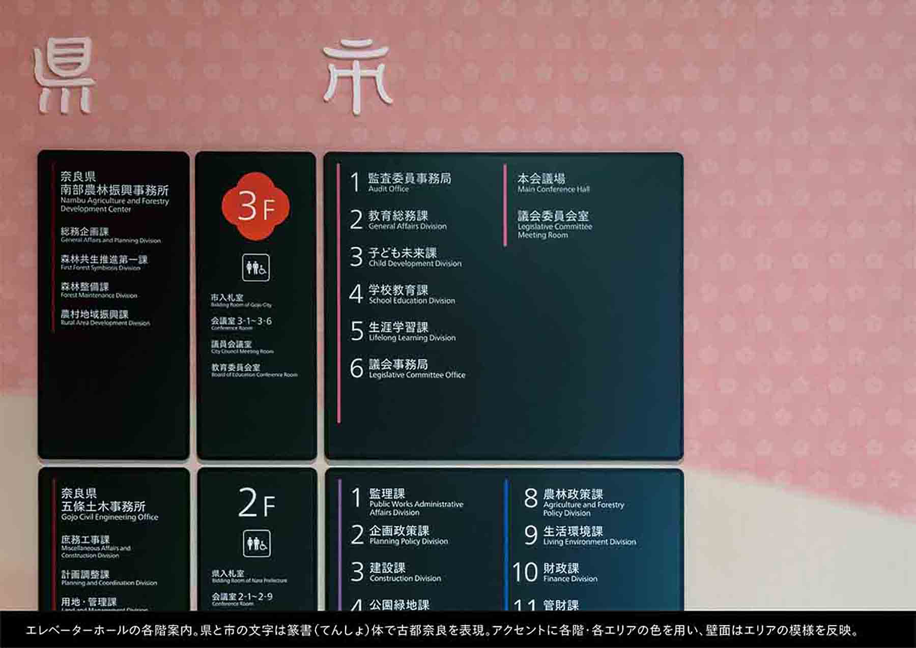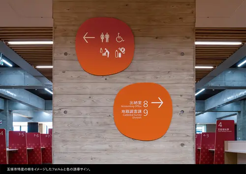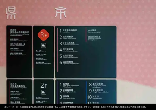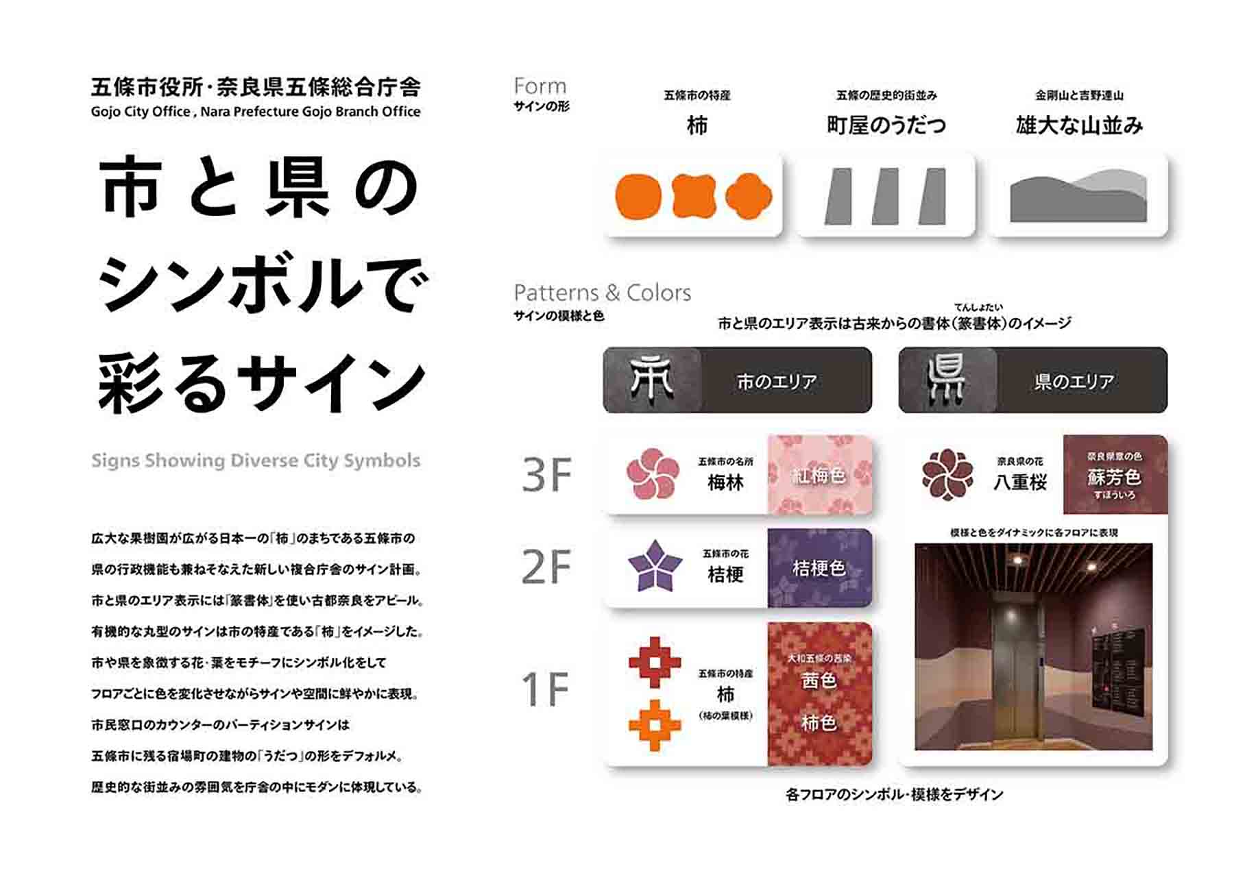 受賞コメント「市と県のシンボルで彩るサイン」市と県の行政機能を兼ねた複合庁舎のサイン計画。エリア表示には「篆書体」を使い古都奈良をアピール。有機的な丸型のサインは市の特産である「柿」をイメージ。市と県を象徴する花や葉をシンボル化し、階ごとに色を変化させながらサインや空間に鮮やかに表現。市民窓口のサインは五條の有名な宿場町の建物の「うだつ」の形をデフォルメし、歴史的な街並みを庁舎空間の中にモダンに体現している。
