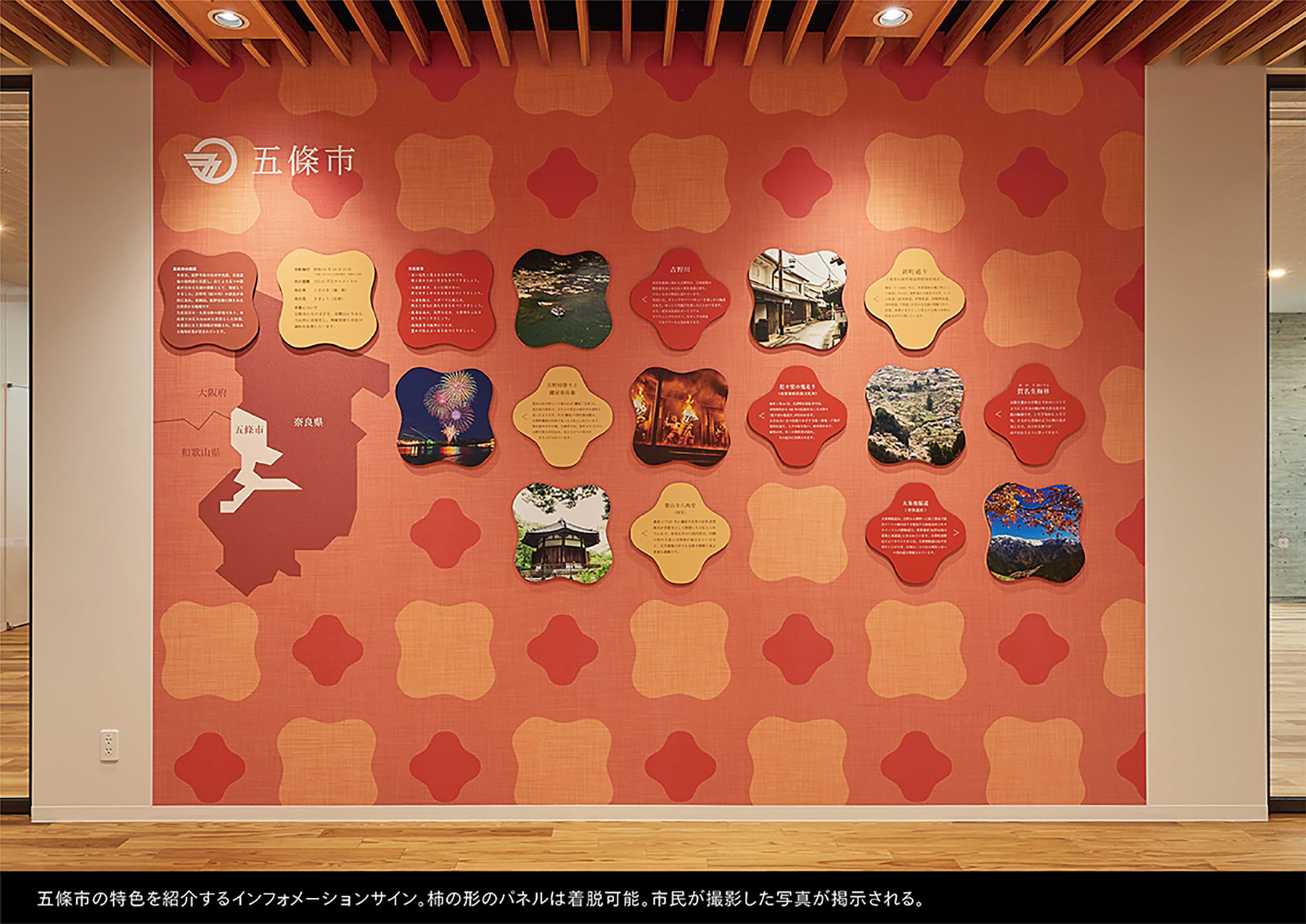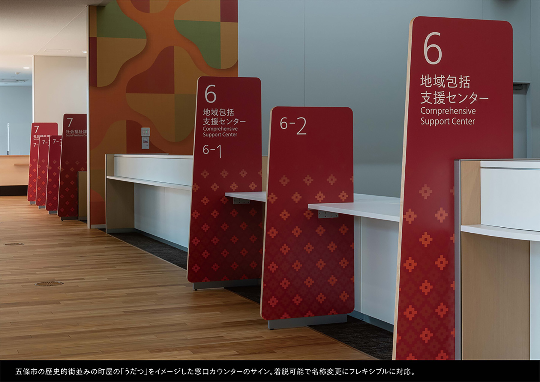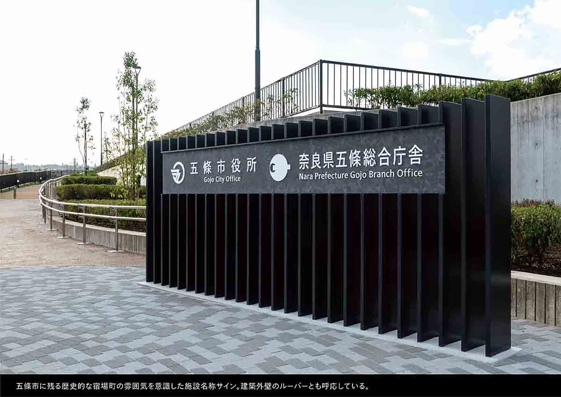受賞コメント「市と県のシンボルで彩るサイン」市と県の行政機能を兼ねた複合庁舎のサイン計画。エリア表示には「篆書体」を使い古都奈良をアピール。有機的な丸型のサインは市の特産である「柿」をイメージ。市と県を象徴する花や葉をシンボル化し、階ごとに色を変化させながらサインや空間に鮮やかに表現。市民窓口のサインは五條の有名な宿場町の建物の「うだつ」の形をデフォルメし、歴史的な街並みを庁舎空間の中にモダンに体現している。