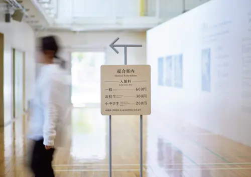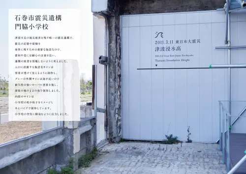 震災遺構となった石巻市門脇小学校のサイン計画である。内部サインは小学校の教室で使う机や椅子をモチーフにしたという。それが見る人に伝わるかどうかは別として、重くなりがちな場所に優しくさわやかな雰囲気を与え、好感が持てる。外部は、説明サインが内部と同一のデザインであるのに対し、名称サインのみ背後の見通しをよくする理由で全く別のデザインとなっているのだが、写真を見る限り見通しに問題はなさそうで、むしろ一つの目的を持った施設でサイン計画のストーリーが分断されていることの方が気になった。
