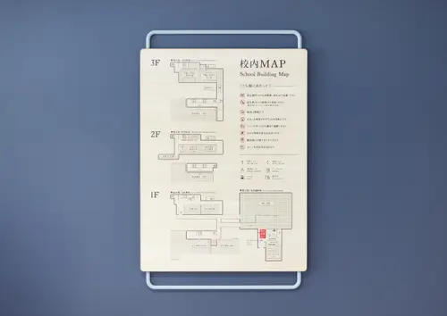 小学校の空気に自然に溶け込むように、また燃え残った机が実際に展示されているので、机や椅子の天板・パイプ脚のディティールをサインの躯体に使用しました。外部サインでは小学校の姿が隠れないようにフェンスを盤面に使用、塩害と耐久性を考えローバル塗装の地のままのグレーを使用しました。