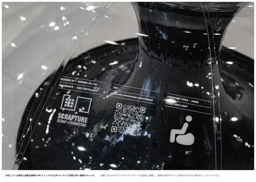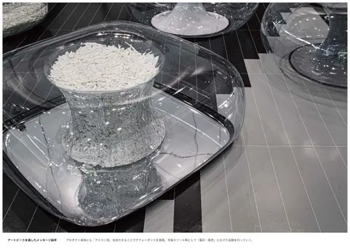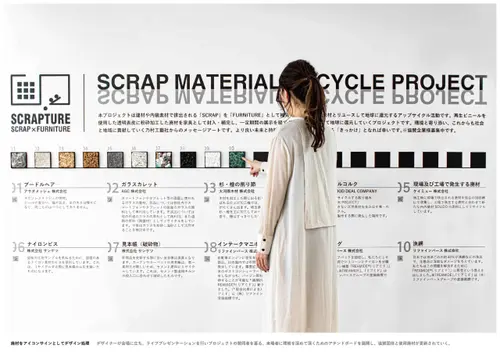 このプロジェクトは昨今SDGsで謳われている端的に言えば、継続可能な地球の未来のために限りある資源の再生へのアクション。ということになるのだが、この作品の素晴らしいのはその大義を難しく専門的な言葉でなく、高度なデザインの技によって可視化し社会に発信したことであろう。誰もがこのアクションとプロセスを直感でメッセージとして感じ取ることの出来る卓越したインスタレーション的な展示とグラフィック。そこからもっと知りたいと思う気持ちにはQRコードを使って深度の深い情報に繋げていけるシステム。そのプレゼンテーションは緻密で一部の隙も無く美しく説得力を持って人々を魅了する。協賛企業との連携、これを発端としたコラボレーションのさらなる展開が非常に楽しみである。