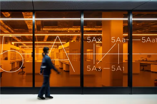 ガラスを通して中の施設をテロップのように表記された数字とアルファベットの連続。まるで組成式が並べられたようなサインは美しくもあり、化学メーカーとしてのアイデンティティが強烈に伝わってくるようだ。サイン機能としてのわかりやすさよりも施設名ともなっているイノベーションを誘発する空間を意図していることが見て取れる。