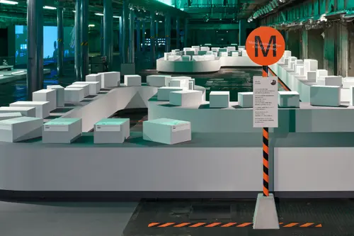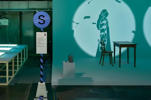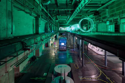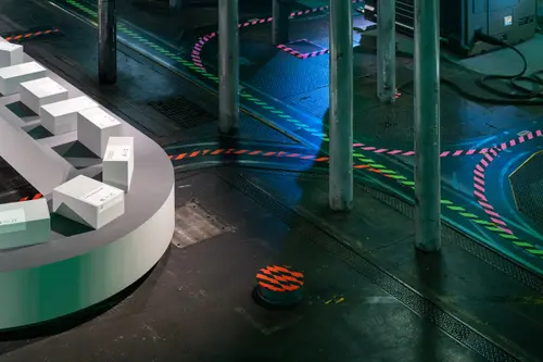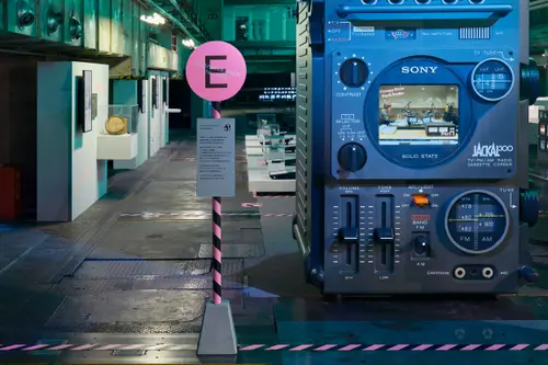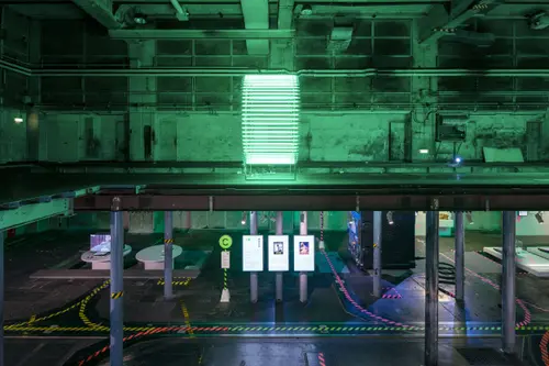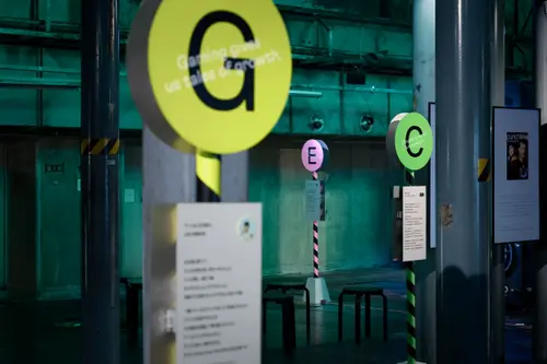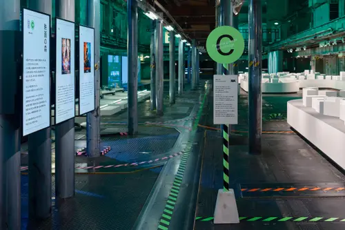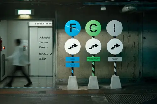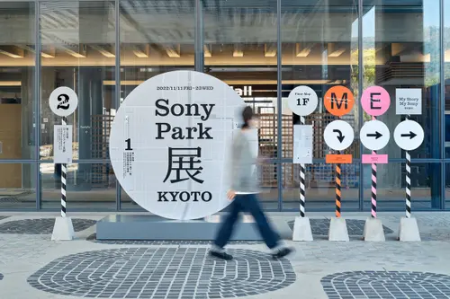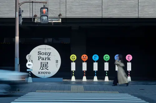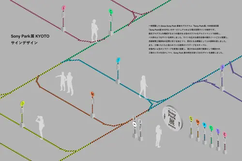 作品意図一時閉園したGinza Sony Park 最後のプログラム「Sony Park展」の京都巡回展のキービジュアルおよびサインを担当しました。6つの展示プログラムを6つの色とアルファベットで表すバス停のようなサインを展示ゾーンごとに配置しました。会場に普段から貼られている黄黒のトラテープをモチーフに、会場内に6色のトラテープを新規に設置。薄暗い京都新聞工場跡地の地下空間に映える色鮮やか視覚表現によって動線とゾーニングをビジュアライズしました。2つの受賞という素晴らしい成果は、ロケーションの力とそれをうまく引き出す空間デザイナーと企画チームとの協業によるものと思っています。ありがとうございました。(色部義昭)