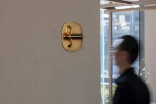The raised information carved on the brass and wood shows a soft and natural transition with the backplane. The soft bulge is the mountain that been walked through in summer and the trace of the spring flowing and the response to the earth.