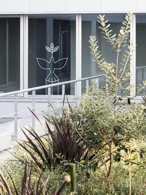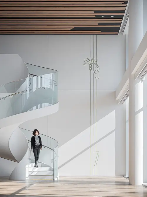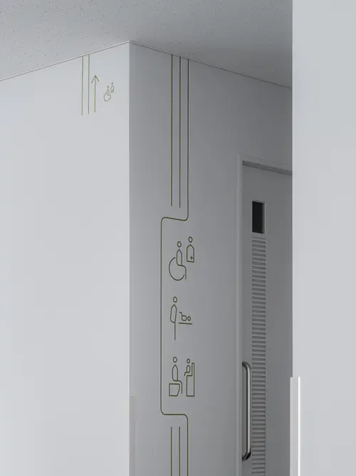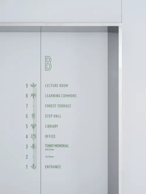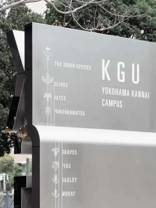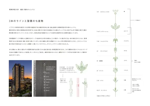 受賞コメントキリスト教の精神に基づく教育を継承する関東学院大学の新キャンパスのサイン計画です。「ノアの方舟」に由来する校章のオリーブの三葉は、三位一体なる神をしめすとともに、教育理想である三育を表しています。そこから、3本のラインが上層階へと導くグラフィックサインを提案しました。また、オリーブを含めた聖書の「七産物」を、各エリアのシンボルとして設定することで、各階の個性を高めるとともに、植物のモチーフが学生の成長をイメージさせます。最上階は、「ノアの方舟」の鳩。大学を巣立っていった学生たちが、成長してこの学舎に戻ってきて欲しいという願いを込めたシンボルとなっています。(藤井北斗)