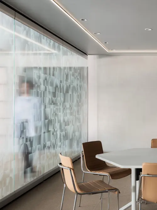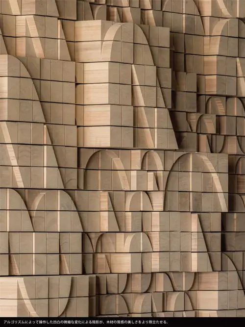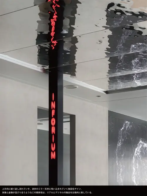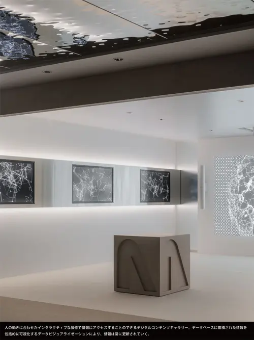 受賞コメントビジネス変革や社会課題解決を目指す、INFORIUM豊洲イノベーションセンター。技術展示中心の場から、リアルとデジタルが融合した多目的な共創の場へとアップデートした。空間にはテクノロジーを駆使したデザインとデジタルコンテンツが同居する。デザインのキーエレメントは、企業のVIの一つである「イノベーションカーブ」。独自のアルゴリズムによって生成した3Dデータを基に、3軸CNC加工機で国産材を加工。同様のアルゴリズムをガラスフィルムにも展開し、半自動的に図柄と透過性を制御した。デジタルコンテンツの各データはノードとして表現され、これらが有機的につながったビジュアルは、企業の目指す情報と人の「つながり」を表している。(小林智行)