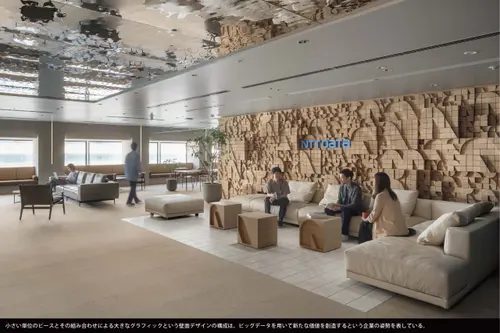 メインとなる見せ場は、NTTの「N」をモチーフとした大きな壁面レリーフだろう。独自のプログラミングによって設計加工が施され組みあげられたこの壁面、国産杉のさまざまなブロックが、大切な自然のリズムを感じさせてくれる。隠されたNのロゴの集合体が、自身の存在意義をここに記録している。このNの断片がガラススクリーン・フィルムとしても展開され、窓部やファニチュアなどにも登場する。が、この「イノベーションカーブ」が、どこまで展開力があって企業アイデンティティを牽引するのかまでは確認できなかった。