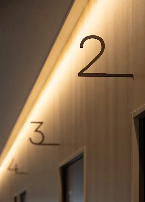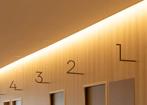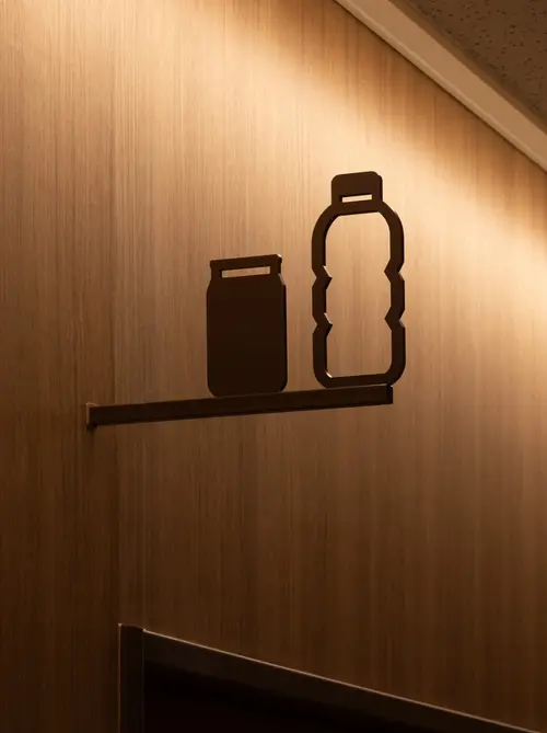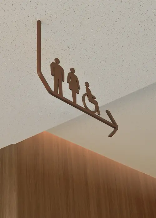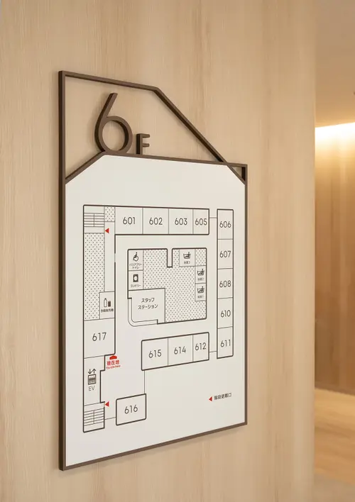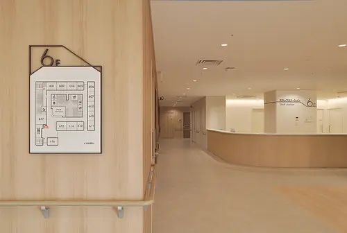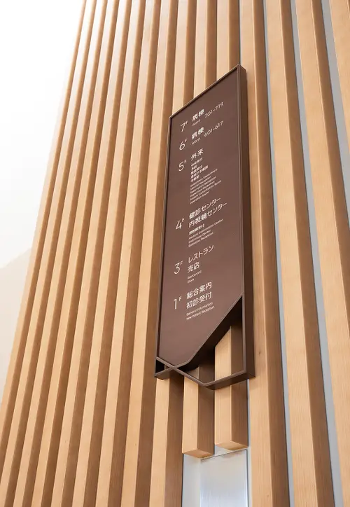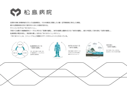 サインコンセプトは「めぐるライン」。予防から治療まで健康維持をトータルに考える「医療の循環」、体内を循環し健康を支える「体内の循環」、絶えず成長して命を育む「自然の循環」。松島病院の理念を表し、来訪者を優しく迎える「めぐるライン」のサイン。